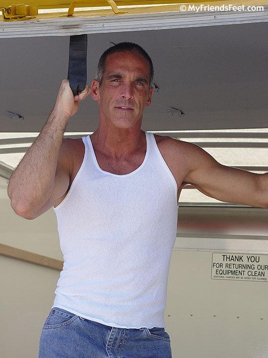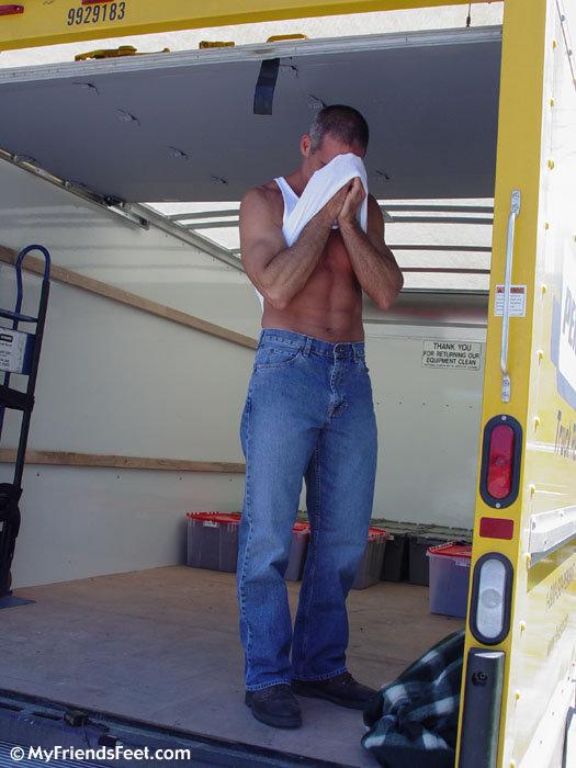 “We noticed a truck down my street a few days ago. The ramp was down and some guys were unloading some boxes. Two out of the three guys were really hot, and we figured that one of my neighbors was moving or something. We wished we had time to stop and photograph them, but we didn’t so we just kept going. The next morning we were headed to the studio and we noticed that one of the guys from the day before was working in the back of the same yellow truck. Since we had the time and we had my camera we stopped to see if he would let me take some shots. He had his shirt off the day before so we knew he had a hot body. Of course we wondered about his feet! We introduced myself to the guy, whose name is Owen. He said that the landscaping company he owned is going to be installing a walkway at my neighbor’s house make of vintage brick. The boxes inside the truck were filled with old brick for the walkway. Owen is a really friendly guy and he seemed happy to take a break and chat a bit. It was a beautiful spring day and the inside of the truck was very warm. Owen, on the other hand, was very hot! We asked Owen if we could take some photos for the site, and although it took a little bit of work we finally got him to agree. We told him that we were going to have my yard re landscaped soon and that we would use him if he let me take the photos. We asked him to take his shirt off early on, and then we had him pull his boots (size 10) off one at a time. His socks were clean but sweaty. We were really wanting to see the feet on this guy, because his fingers were very attractive. His feet were a little rough, and he said that he is tough on them, but overall they are beautiful! The soles show such a strong arch, and they crinkled up in such a sexy way once he curled his toes. We asked if he was ticklish and he laughed and said, “Maybe a little. No body has tickled my feet recently!” Hmmm… I’ll try to work on that!”