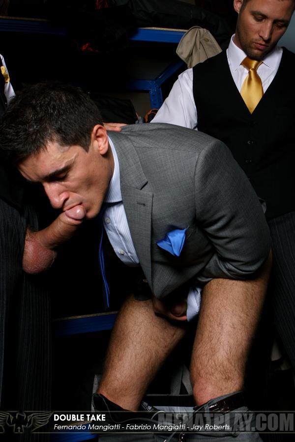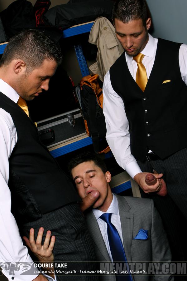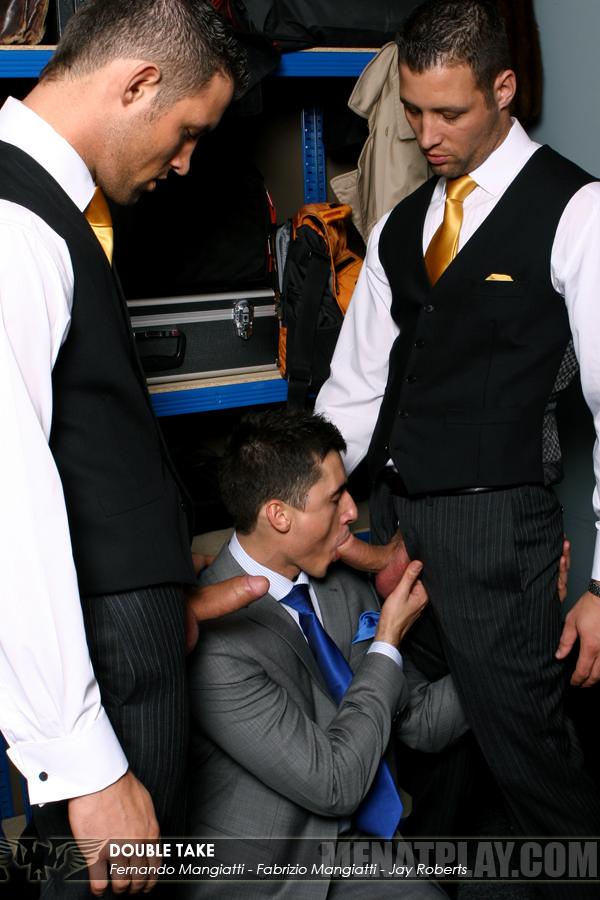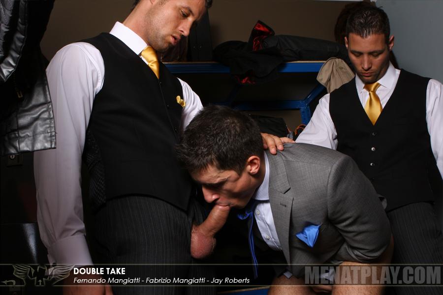 “For the Mangiatti twins, mistaken identity are part of their day to day especially at their job as hotel porters. But when these misunderstandings leads to verbal abuse from a demanding guest they have to draw the line and clear things up. But unable to communicate this just leads to further confusion, as the twins mistake an apologetic tip with a ‘service fee’ and as usual they casually take their thick uncut dicks out and push their guest to his knees in warm up for a double Mangiatti ass fucking. And with two brothers’ cocks pushed in his mouth who is he to say no?”