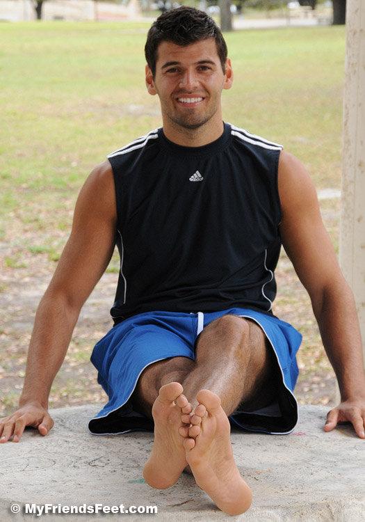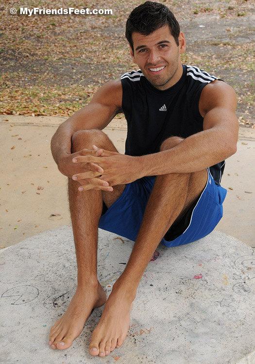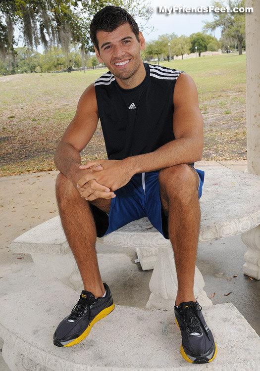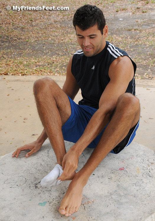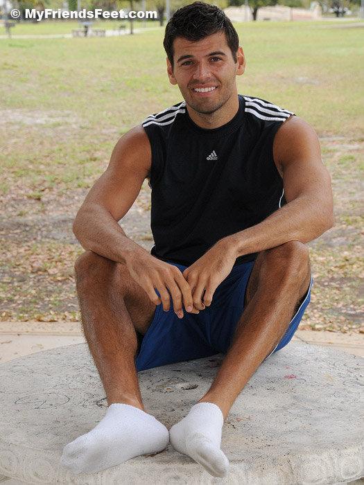 When we at MyFriendsFeet think of a guy who is tall, dark and handsome I get a picture of Timothy. The icing on the cake is the fact that he has huge size 14 feet. Actually, he says in athletic shoes he wears a size 15. We went to the park to do a shoot and it started raining, so we went under a pavilion and got these shots of his huge feet and kinda smelly white socks. His socks were fragrant and slightly dirty when he took those big shoes off!