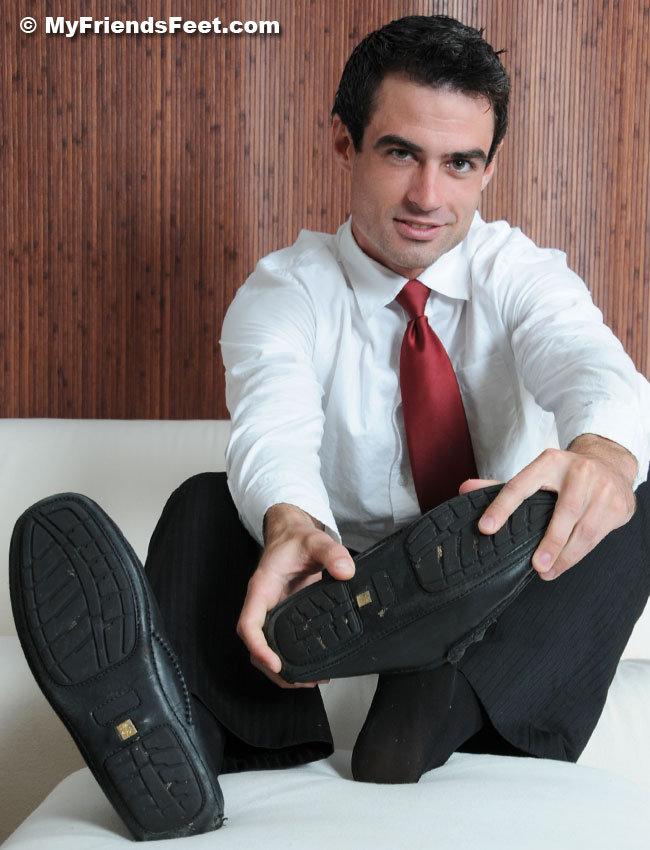 With his muscular and hairy body and movie star face, Sawyer looks great no matter what he is wearing. When he is all dressed up and clean shaven, though we think he looks his best. Since he always has that bad boy glint in his eyes we know that the conservative exterior is just that a facade. In these MyFriendsFeet photos Sawyer has sheer nylon socks on and they are so sexy. He told me that he loved wearing them. Of course his bare feet are amazing too!