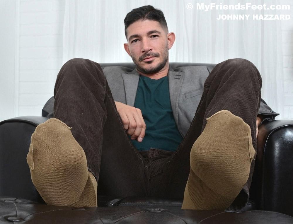 “Porn star Johnny Hazzard stopped by MyFriendsFeet one day saying that he wanted to show off his feet in a photo shoot for us. I was all for that, of course and had him drop by as soon as possible. Oh boy, one of my favorite porn stars on my site. And with a gorgeous pair of feet on him, Johnny is the perfect foot model. He loves his gold color dress socks too. I love Johnny’s slightly hairy chest and studly demeanor!”