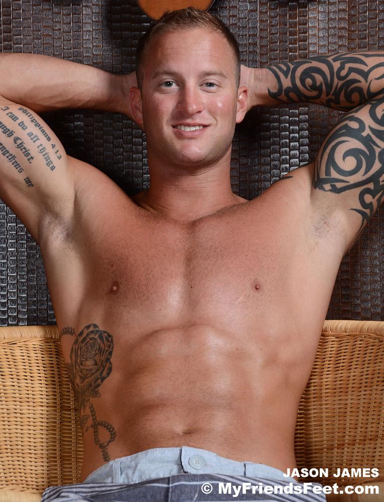 “Jason James is one super sexy hunk, there’s no doubt of that. And on top of his handsome face and lean, tattooed body he’s got a pair of feet that are more than hot enough for my site. Jason showed up for this photo shoot Floridian style in shorts, a muscle shirt and flip flops. He says he tries to wear flip flops consistently and likes to show off his nicely tanned feet. I love this guy!”