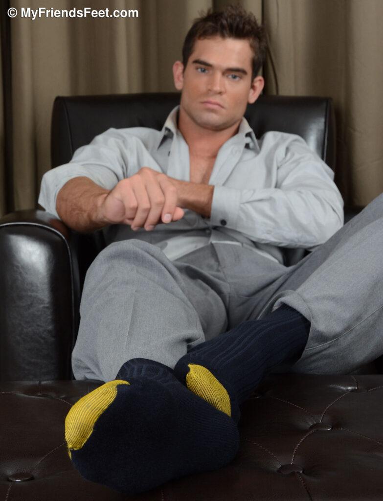 “It’s always great to see Luke Milan, for the man is absolutely gorgeous! Talk about the ultimate foot stud. Luke is also very smart, funny and looks sensational in a suit. Especially when he shows up in black and gold dress socks. Of course, when he finally bares his masculine feet that is when he reaches full stud status. I made sure to capture some great closeups of Luke’s dress socked and bare feet!”