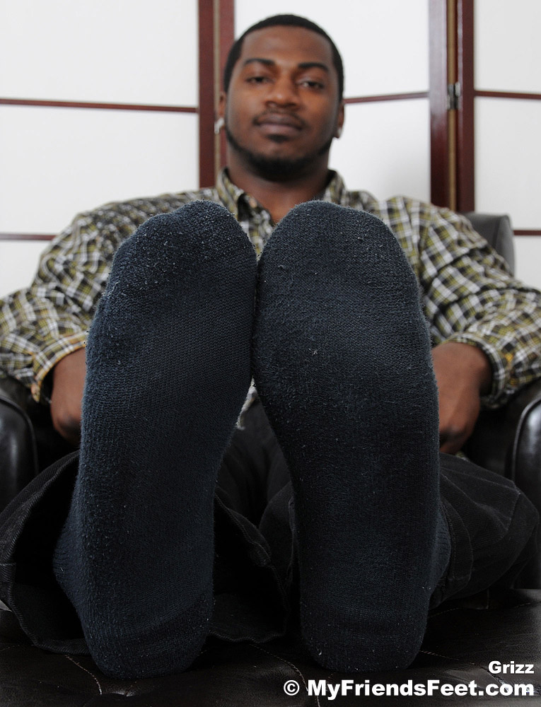 “It was great to see big, black, foot stud Grizz again. He’s so handsome and his size 14 feet never grow old to my eyes. How could they” Grizz showed up in some nice clothes, which included black dress socks. He teased me when taking them off. Standing all of 6’4″ tall, Grizz is quite a sight to behold. Especially when he’s only inches away from my camera lens while showing off his wide soles and big toes. They’re ticklish too, I found out a while back. So nice to have this big, sexy man back!”