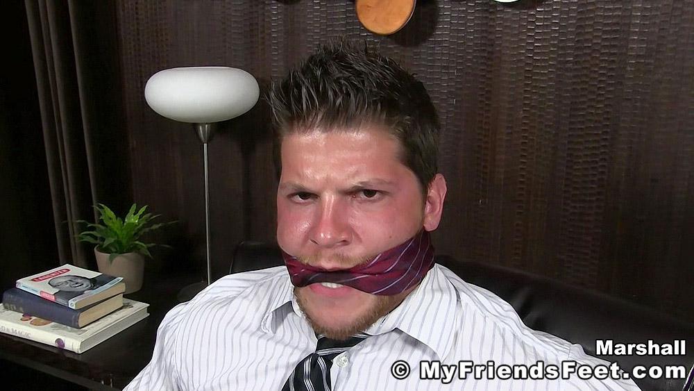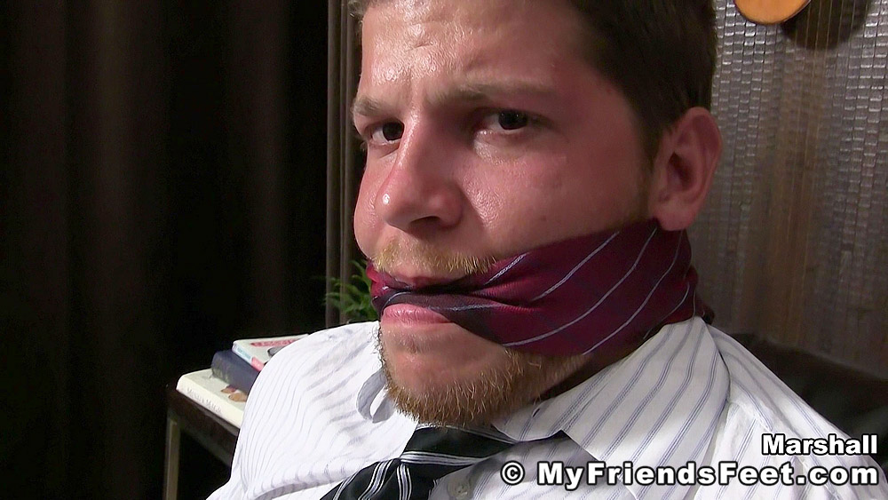 “I hadn’t seen stunning stud Marshall in a while until he showed up to stay at my place for a week a while back. He likes to take naps on my leather chair, resting his feet on the matching ottoman. This time I took advantage of him in that scenario, tying his hands around the chair and his feet to the ottoman. After waking up, Marshall tried his best to fight his way out of the bondage, but no dice. Over and over again he would fight his way to complete exhaustion, falling back to sleep each time. Of course, I would grab each opportunity to take off his dress socks and open up his dress shirt to expose his gorgeous chest and torso. The fantasies this bondage scene conjures up are endless!”