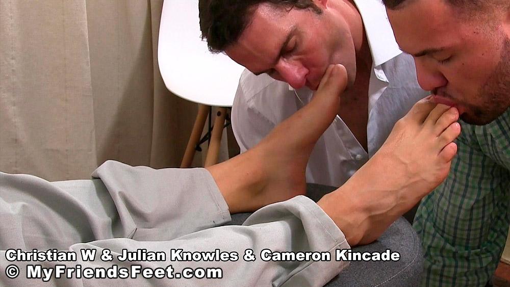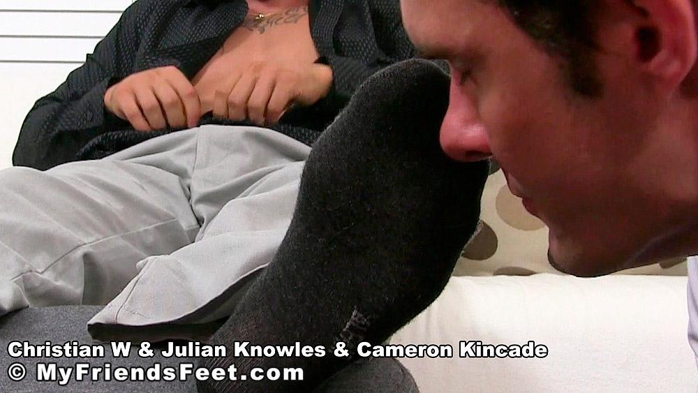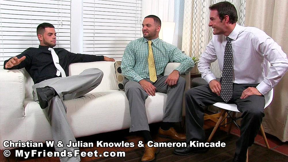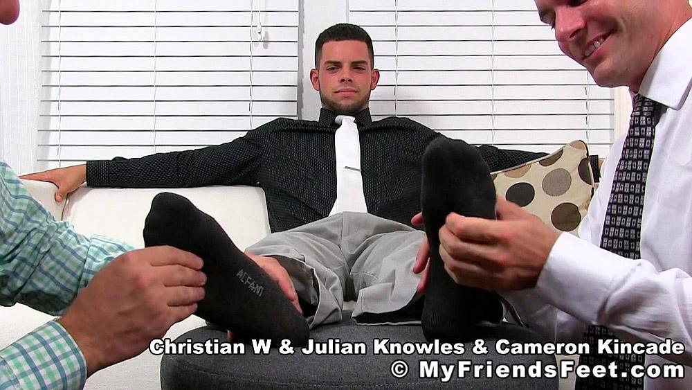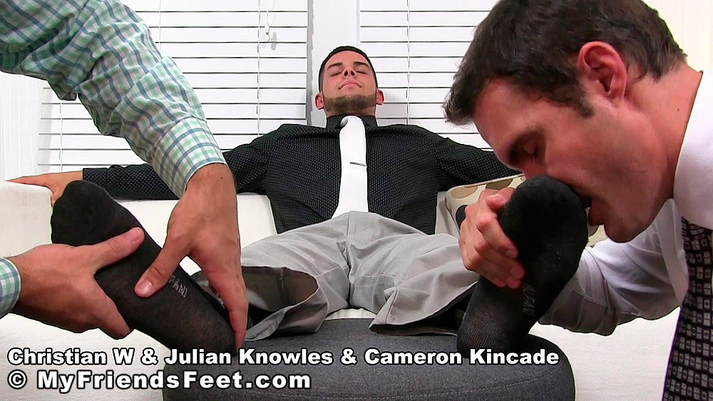 “Christian is the new guy at Julian Knowles and Cameron Kincade’s work and to initiate him into the ‘group’ they convinced him into letting them worship his feet. They certainly wasted no time getting to it either, dropping to their knees while each took a socked foot to worship. First, Christian was adored while socked, then eventually the socks came off and he received the foot love he quickly learned how to appreciate and adore. Who wouldn’t love and adore Christian’s perfect size 11 feet?”