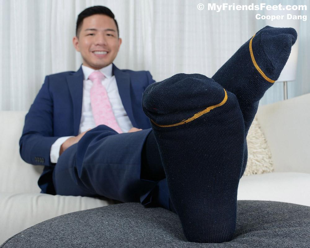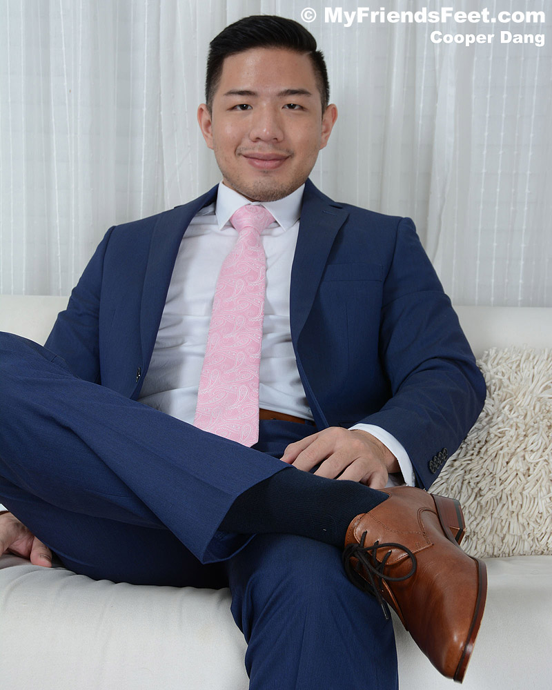“Cooper is a Korean man with amazing size 10 feet and a hot body. He told me he had always wanted to do a foot fetish scene with somebody. He has great size 10 feet and when he was dressed up in his suit he looked so sexy. Once he took his shoes off to show his dress socks his sexy level increased considerably. He’s a very laid-back guy and showing off his bare feet while relaxing on the couch was a pleasure for him. He also tells me that he’s ticklish too.”