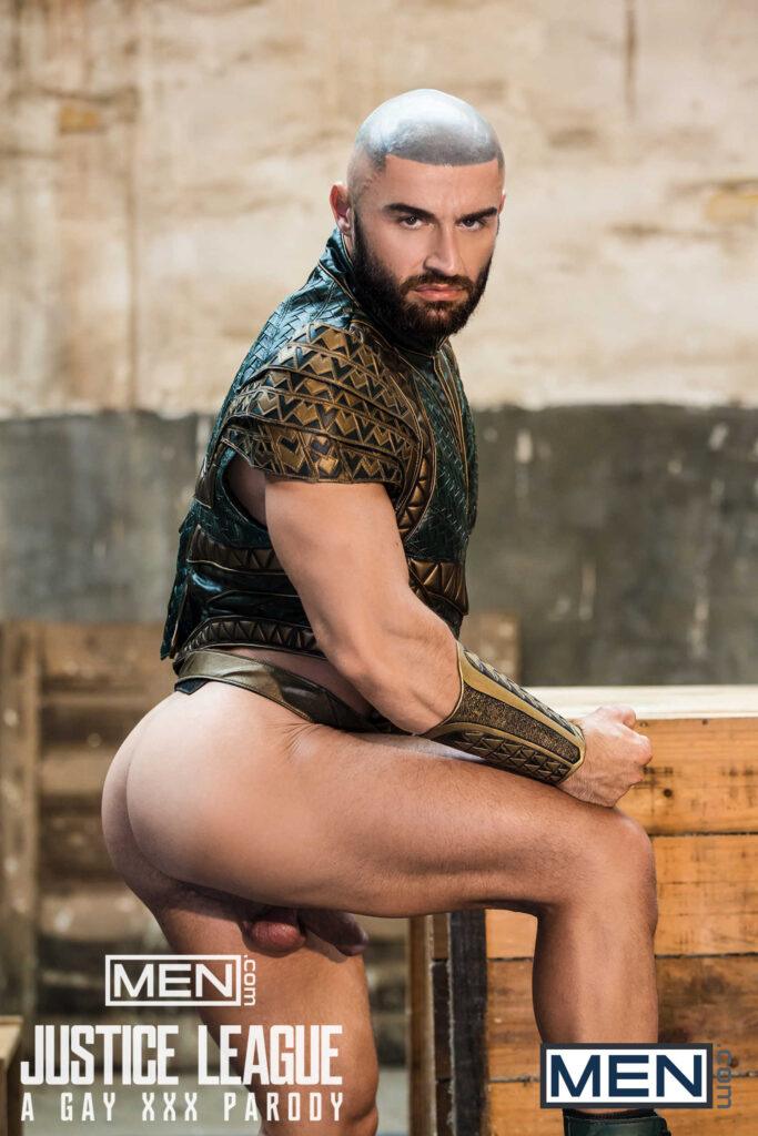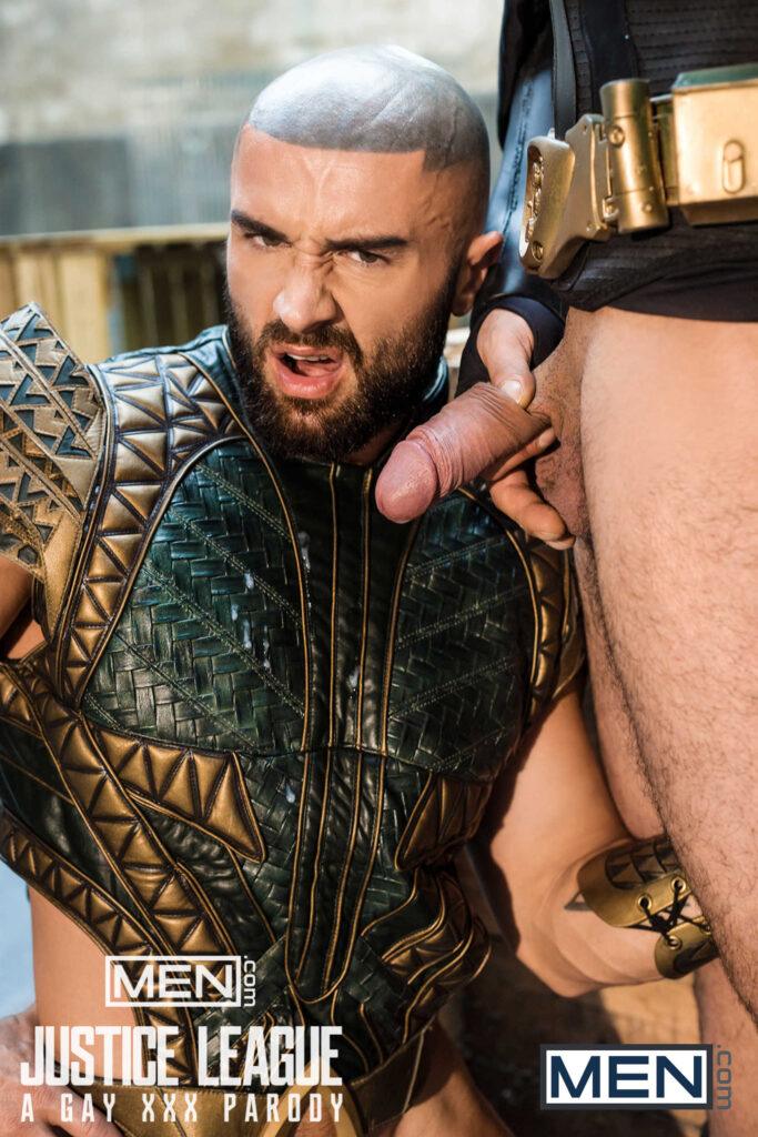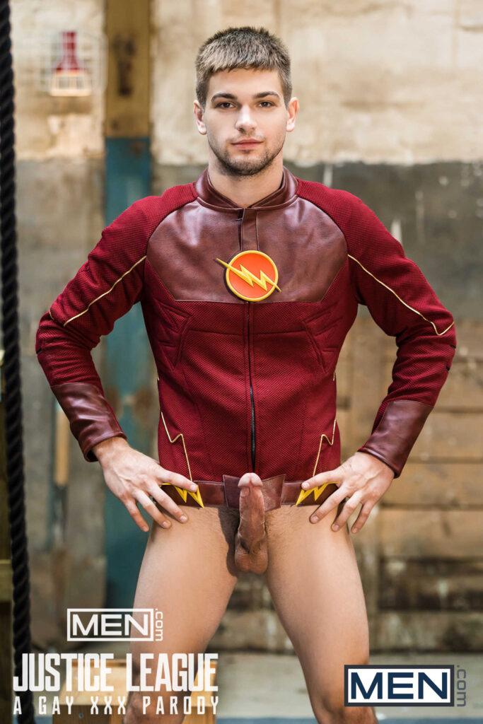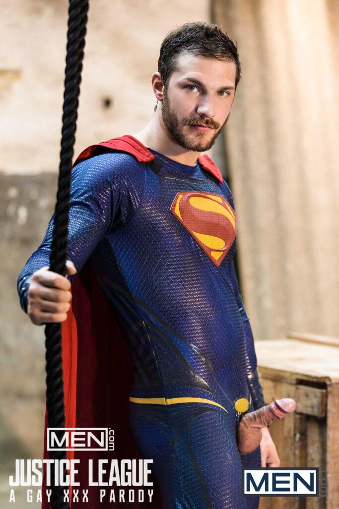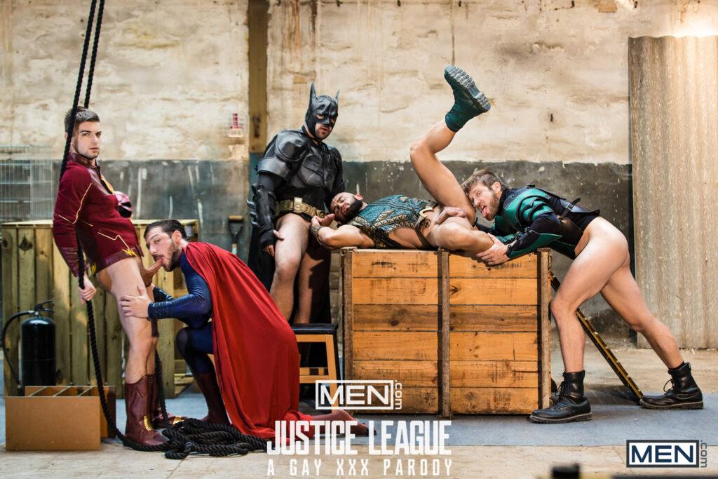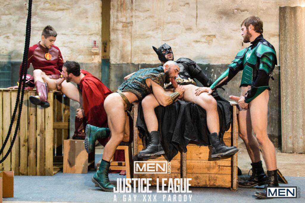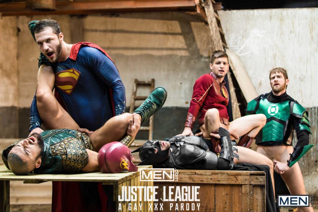 “The superheroes (Colby Keller as Green Lantern, Francois Sagat as Aquaman, Johnny Rapid as The Flash, and Ryan Bones as Batman) rejoice when they discover Superman (Brandon Cody) is alive! What better way to celebrate than by having a full-on orgy.”
