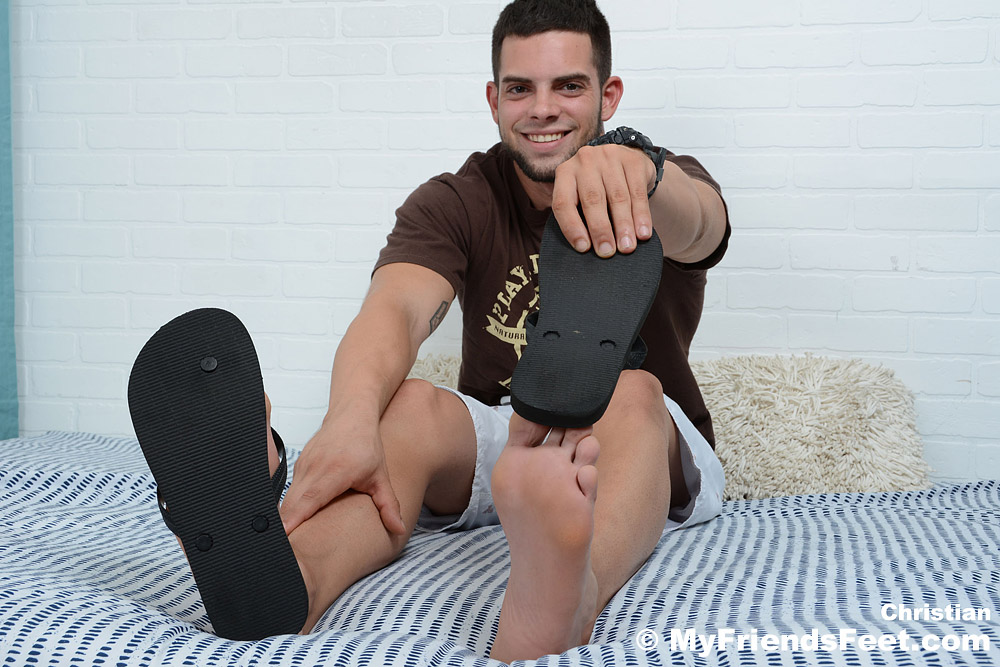 “College student Christian has everything I find really sexy on a guy. He’s got a devilish grin, a great body and an amazing pair of feet that are right at home in flip-flops. His size 11’s have such smooth soles and are also ticklish. Christian loves to have guys admire his feet because he takes good care to make sure they look good.”
