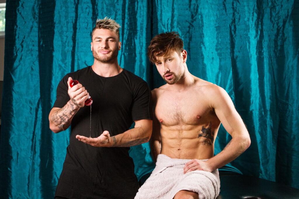 “Tall athletic hunk Drew Dixon paid top dollar for his two on one massage and when his masseurs show up late he’s furious. William Seed and his colleague try their best to make it up to Drew, but the brown-haired dude won’t quit his complaining. When Drew tells William to get really deep with his massage William takes it to heart, shoving his thumb into his tight hole. The blonde beefcake doesn’t stop there, sneakily fucking and stroking Drew behind a dividing curtain while his colleague is none the wiser. The two muscular men grope and grind, getting hot and heavy as William jackhammers Drew’s hungry hole. William gives Drew the hole-stretching ass pounding of a lifetime, making him beg for more as the tattooed super stud plows deeper and deeper into Drew until they both blow their thick loads all over the parlor.”