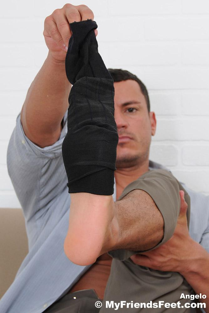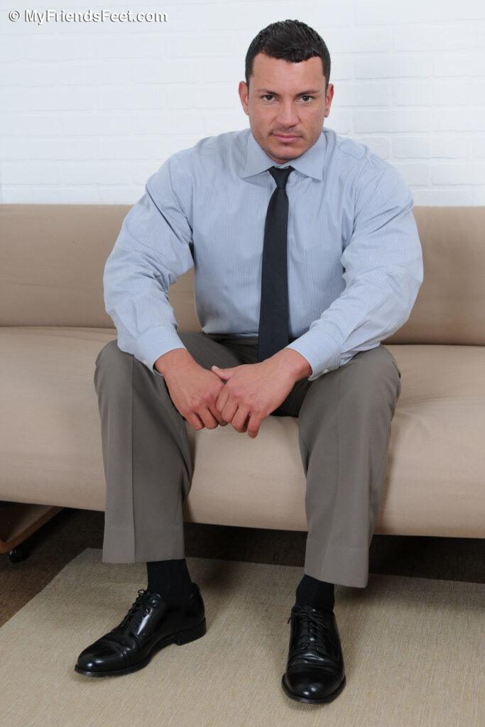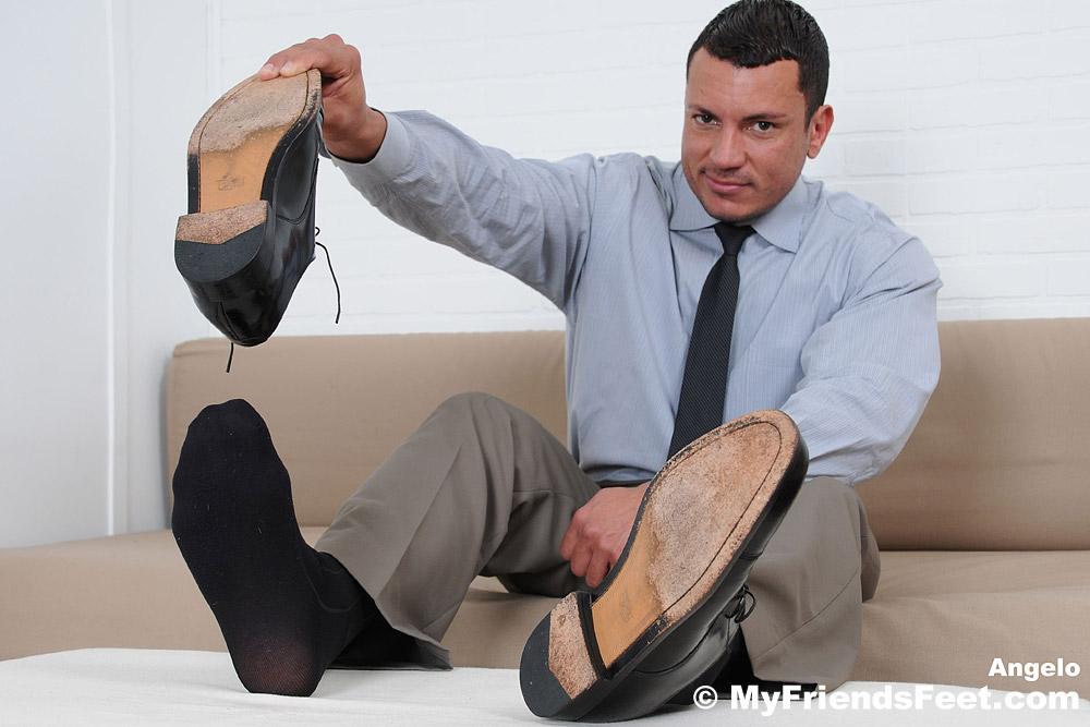 “Angelo has great feet. His wide size 11 feet are so smooth yet masculine, just like his sexy chest. In his office attire and navy blue dress socks, he is the vision of the boss that oozes testosterone. You know his socks smell great as he pulls his shoes off his hard-working feet. Then the socks come off one by one so that you can get a close-up look of his toes and soles. He loves having his feet serviced after a long day, but who is going to massage his feet?”