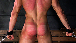 “Stefano is solid muscle from head to toe, a Greek god, a man of incredible strength, at the peak of his physical prowess, but now he is utterly helpless, chained at his throat, wrists and ankles, a slab of meat, completely at the mercy of a man not half his size. He has been shipped to our dungeon by has new master, a rich Roman aristocrat, who has hired us to torture him mercilessly, live on camera for all to see. Professional sadist Anthony Martin has stripped and blindfolded Stefano. His body has been shaved smooth, like marble. And now he is being brutally flogged, up and down his V-shaped back and bulbous ass. Anthony puts down the whip only long enough to fondle the muscle boy, then goes right back to whipping him and misting the fresh wounds with alcohol, sending that glorious body into new spasms of pain.”