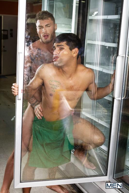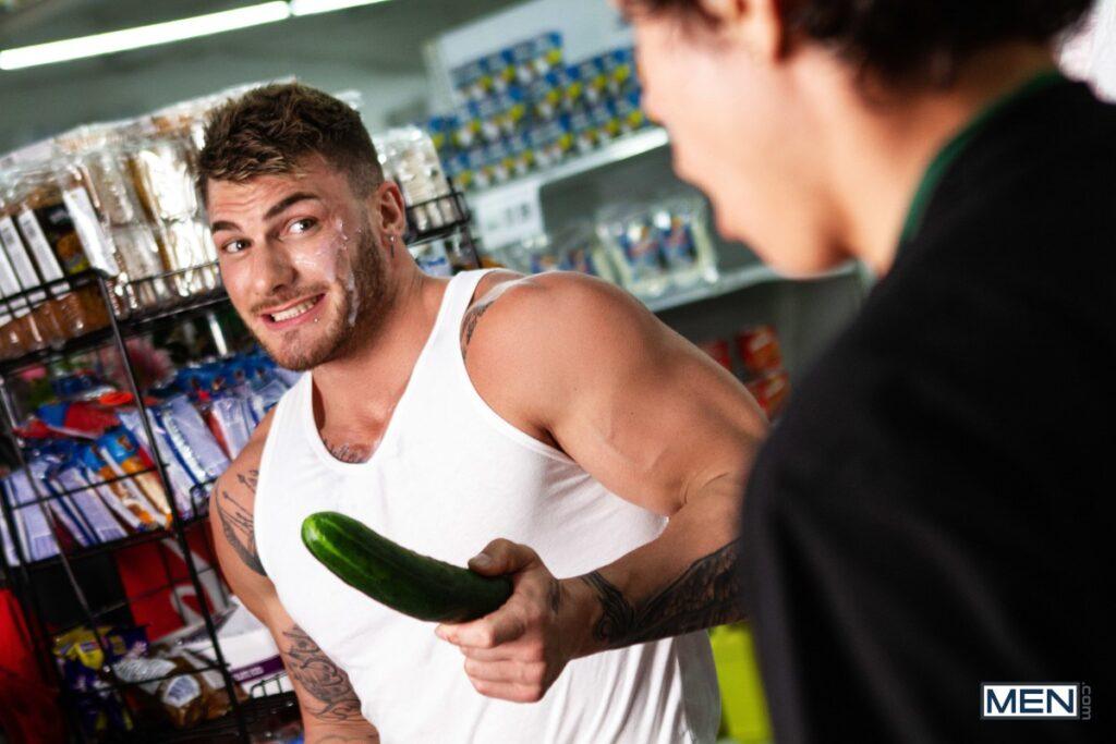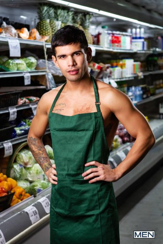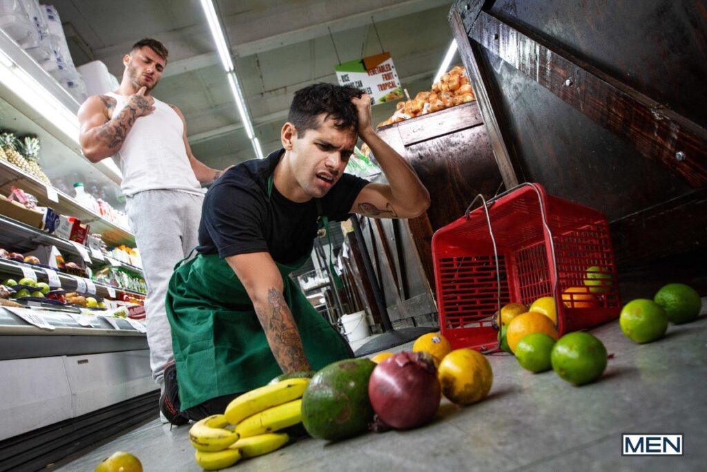 “Ty Mitchell’s boring grocery store job gets a lot more exciting when he spots muscular hunk William Seed doing his shopping! William’s muscle ass and huge bulge in his sweatpants are so distracting, Ty drops his basket of veggies and has to get on all fours to pick them up. William checks out Ty’s booty and sneaks up behind the twink, pulling down his pants and fucking him doggystyle in a real “meat cute.” Ty sucks William’s dick in front of the freezers before riding William’s eggplant emoji till he cums, and then William gives Ty a face full of man milk.”