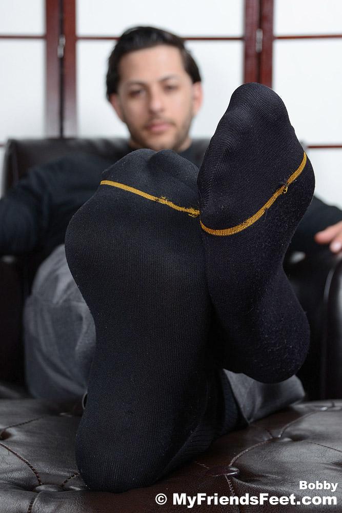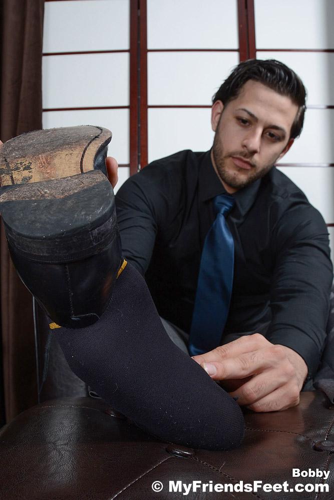 “Bobby looks so sexy in his dress socks and dress clothes. You can tell his feet are sweaty after a hard day at the office. Once he takes his socks off you can tell his wide size bare feet 10 are looking delicious!”