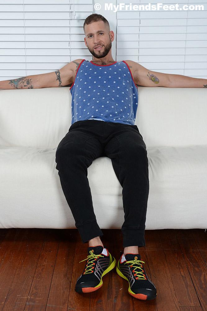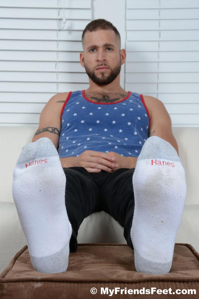 “Tino is lounging around after spending his day running around doing errands. Now it’s time to put his feet up and rest his tired feet. Tino’s sexy body looks lean and ripped as he pulls his shirt off and then his shoes. His socked feet have a sweet aroma. Soon he pulls the socks off too and curls up for a barefoot nap.”