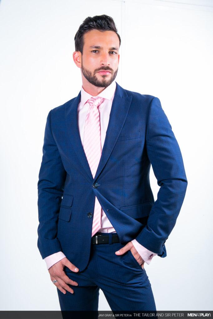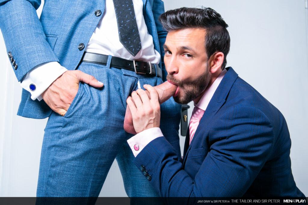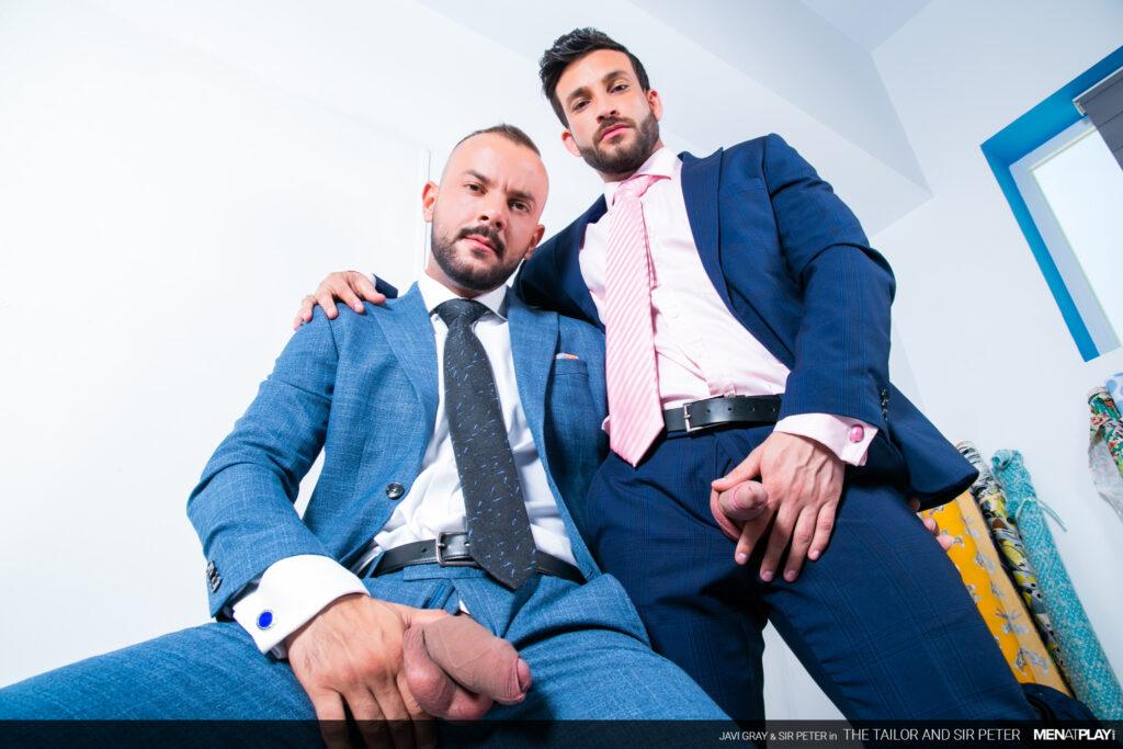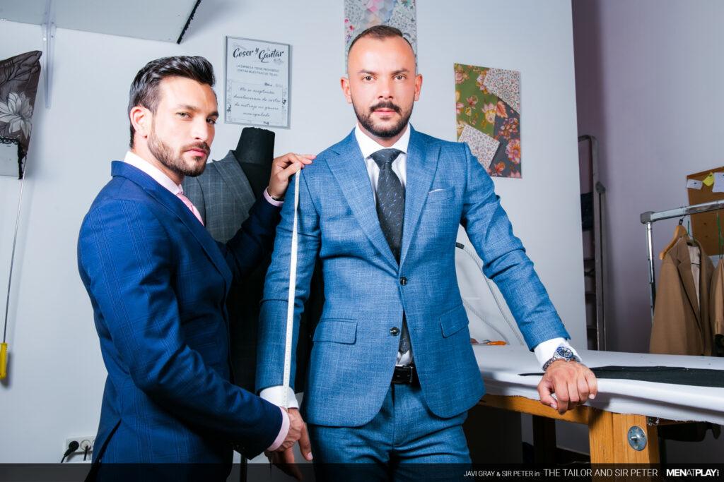 “Sir Peter is picking up a new suit at Javi Gray’s tailor shop that he needs for an event later this evening. But when he arrives, Javi brings out a suit that is the wrong color. It seems as if he got his notes mixed up. Not to worry. Javi has options in the back and while dressing Sir Peter, he can’t ignore the big bulge emanating through the suit paint. In the end, problem solved and a big-dicked suit sex play session as a reward.”