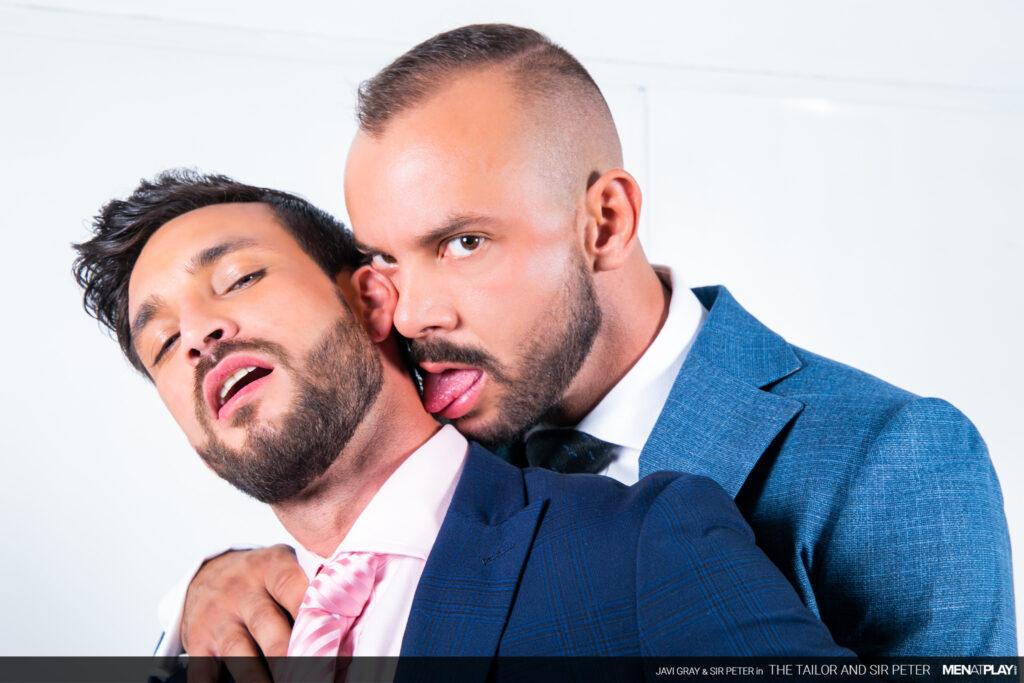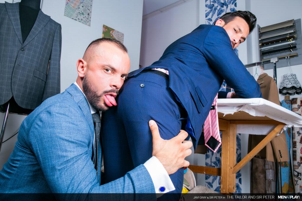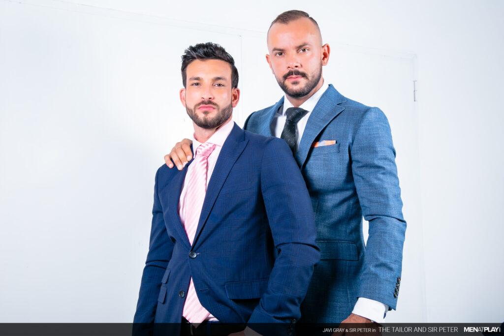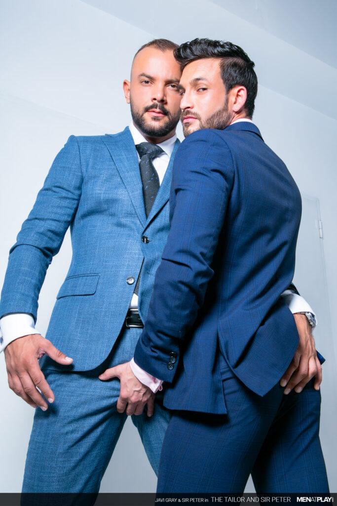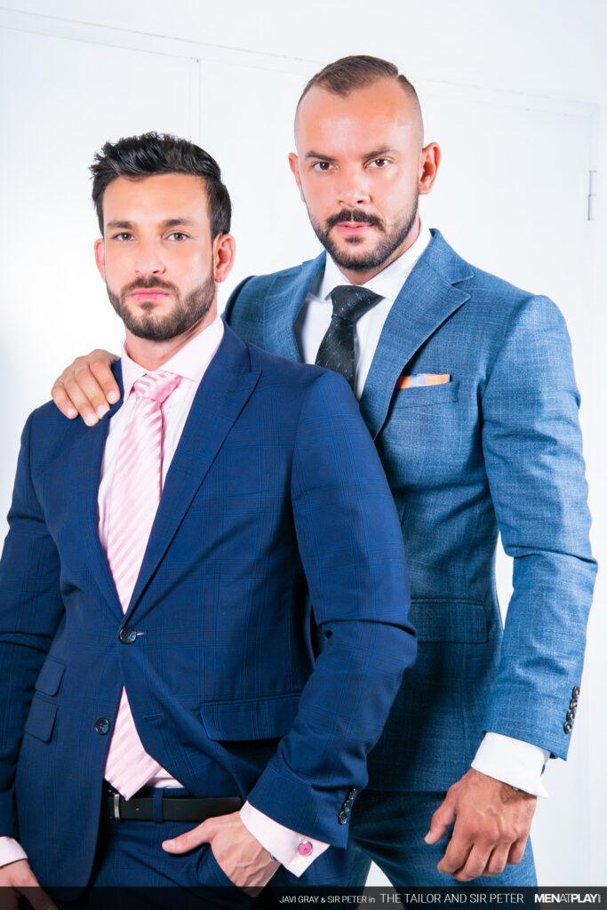 “Sir Peter is picking up a new suit at Javi Gray’s tailor shop that he needs for an event later this evening. But when he arrives, Javi brings out a suit that is the wrong color. It seems as if he got his notes mixed up. Not to worry. Javi has options in the back and while dressing Sir Peter, he can’t ignore the big bulge emanating through the suit paint. In the end, problem solved and a big-dicked suit sex play session as a reward.”