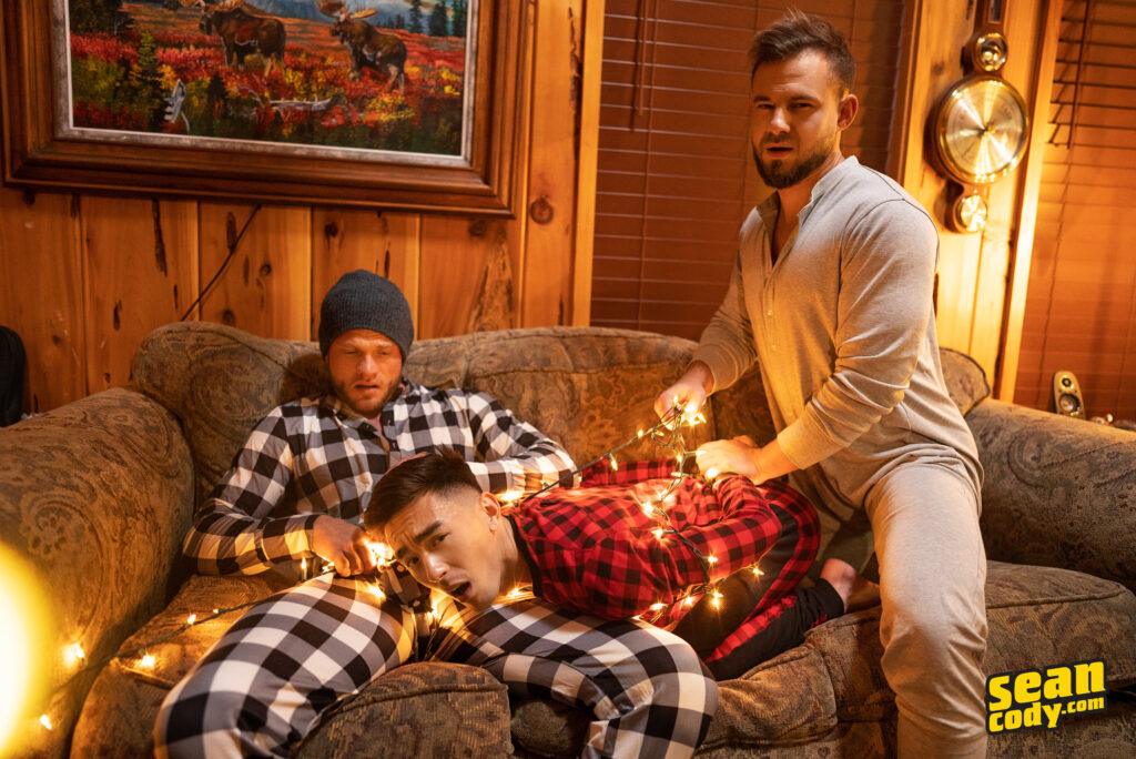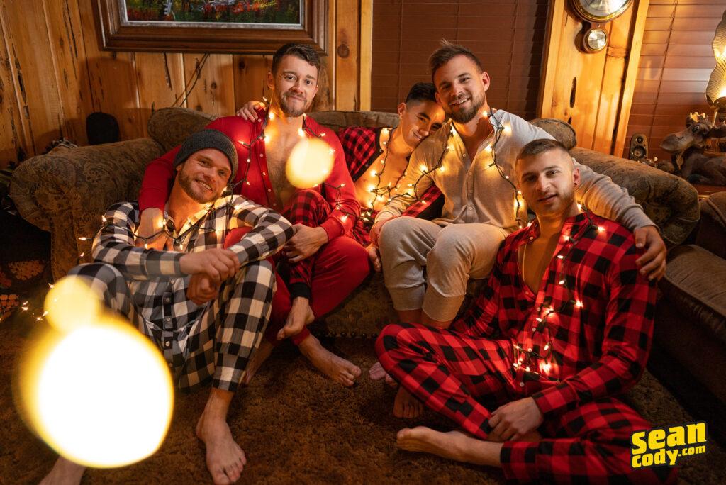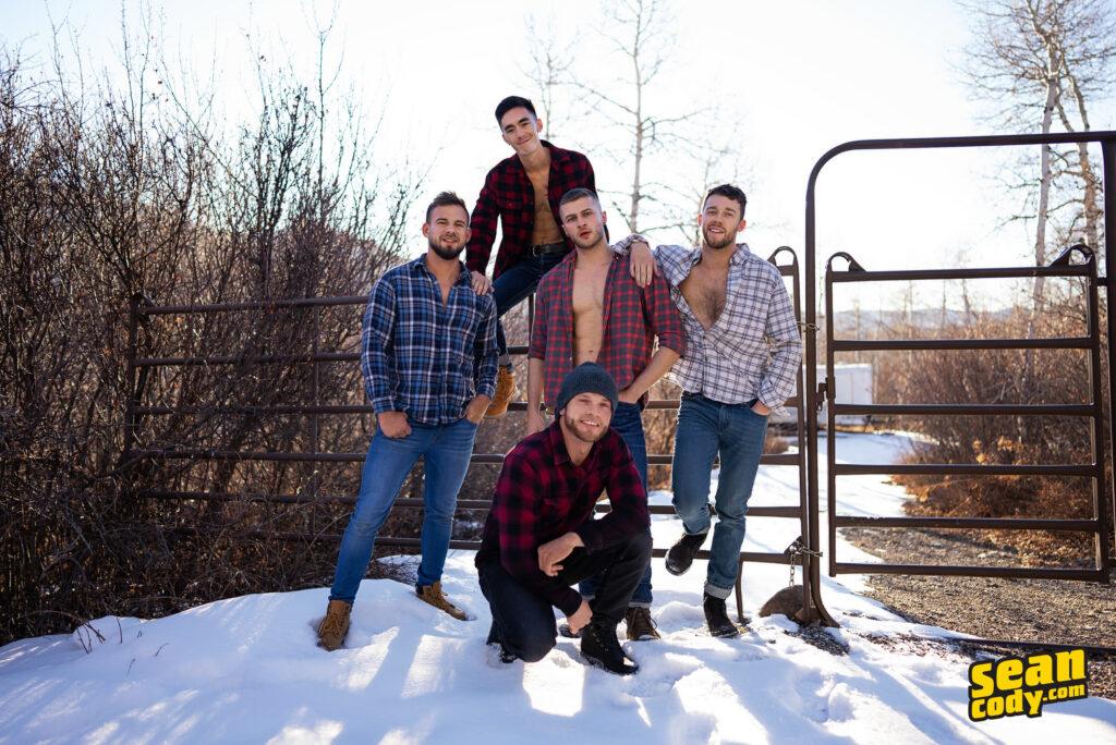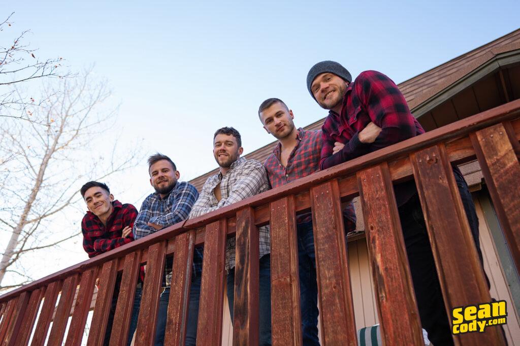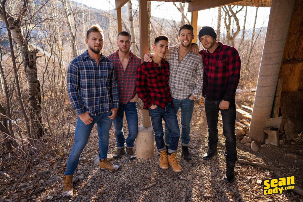 “The weather is getting chilly so Sean, Josh, Justin, Cody Seiya, and Devy head outside to chop some wood for a fire. The guys take turns to see who’s best at handling the axe and splitting some logs as they chat about their favorite kinds of cocks! They build a toasty blaze and start getting romantic by the firepit, then head indoors and strip down to their long underwear as they start kissing and caressing each other’s hard bodies on the couch. The hunks take turns sucking each other’s dicks and even form a five-man blowjob line, before Justin becomes the first to take a cock, getting penetrated by Josh in doggystyle. This orgy heats the cabin right up until everyone takes turns fucking power bottom Cody and cumming all over his muscular body!”