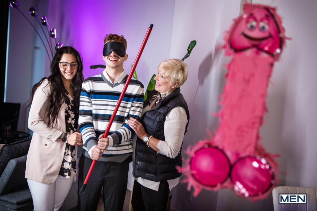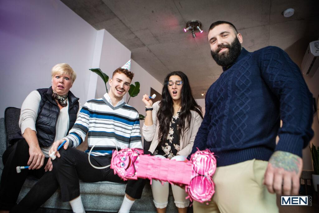 “Ryan Jacobs is having a small family birthday celebration when his stepdad, Markus Kage, struts in with a piñata… or rather, a peeñata! As Ryan’s mom and sister chat in the living room, they guys go into the kitchen to hang up the dong-shaped decoration. Ryan catches Markus checking out his ass, so he pulls down his pants and his stepdad starts rimming him. The twink then lies down on the counter so Markus can fuck his mouth! The dudes hurriedly put their clothes back on when the ladies come over, but as Ryan tries to hit the piñata he accidentally knocks out his mom and his sis. Markus consoles him with some cock, getting the bottom naked and fucking him on the couch. The burly stepdad even picks Ryan up for a stand-and-carry before Ryan rides the top’s cock till he cums, then takes a birthday facial.”