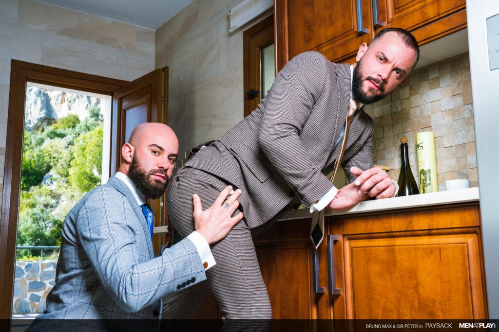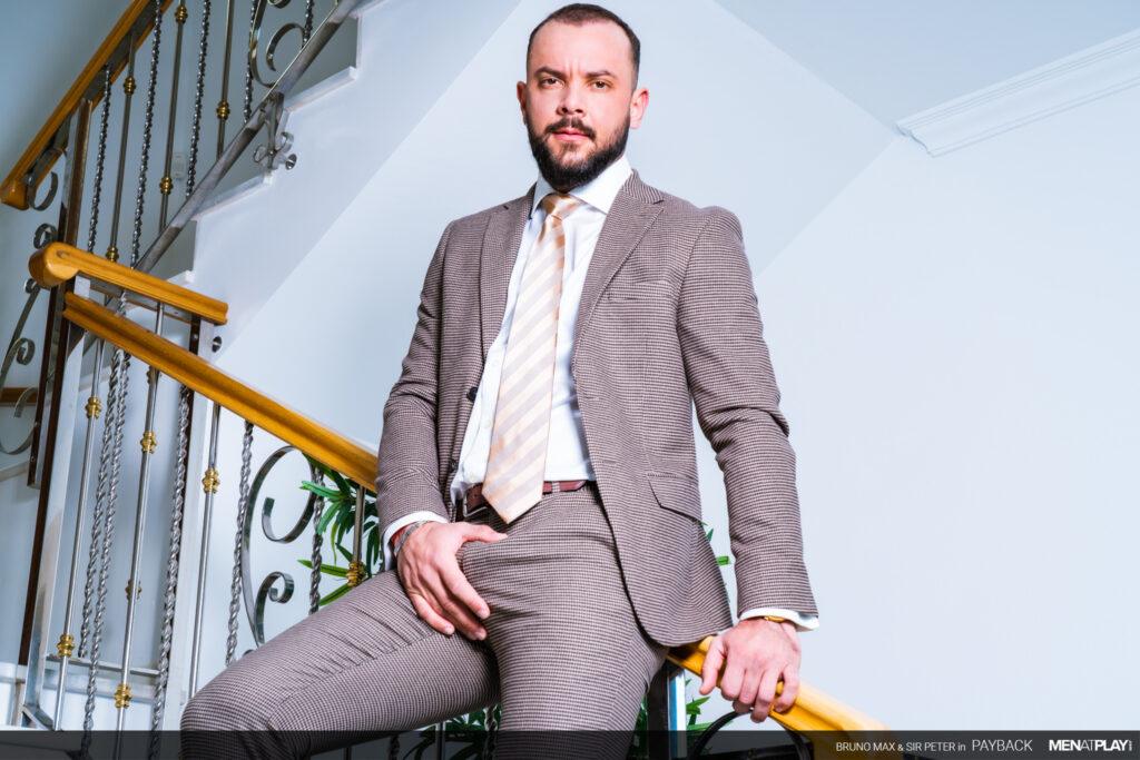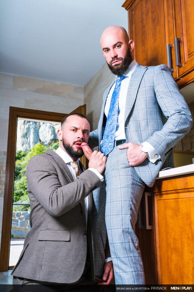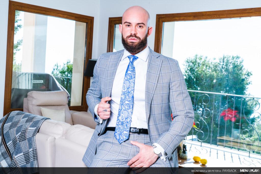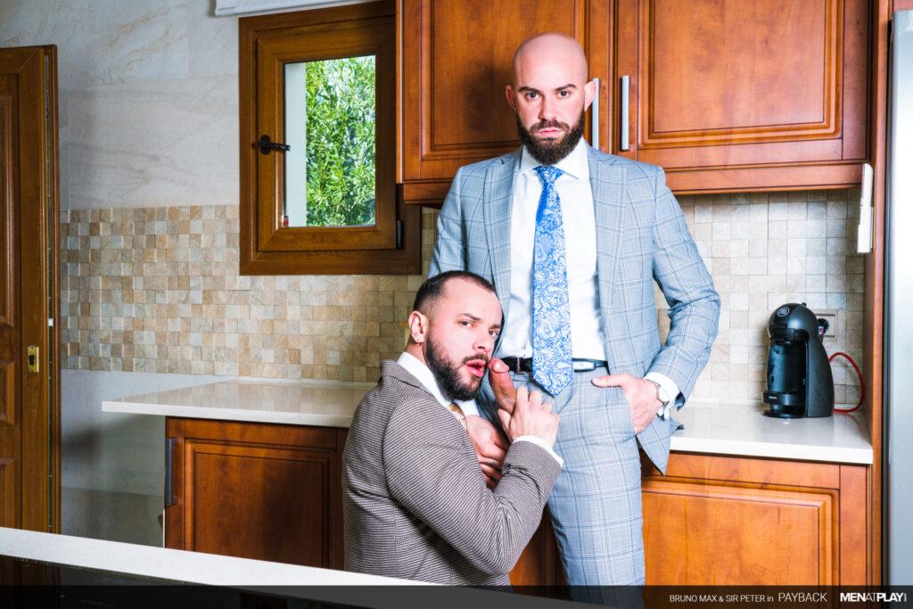 “Sir Peter is having an online meeting with his team when suddenly his boyfriend Bruno Max walks through the background naked, just wearing a towel wrapped around his waist. After the meeting, the embarrassed Sir Peter confronts Bruno and they begin to argue. Seeing as how Bruno doesn’t show any remorse, Sir Peter decides to pay him back by making him late for work. And, Bruno will need to change his now cum stained suit!”