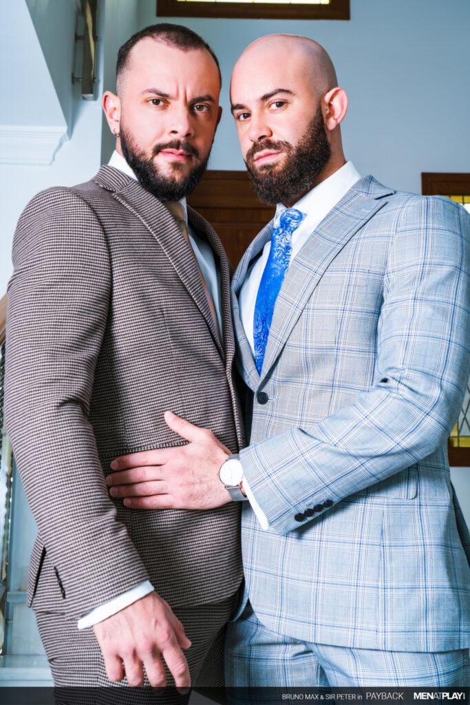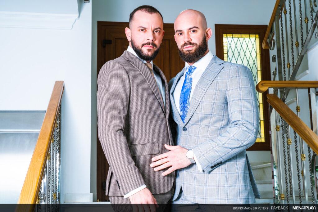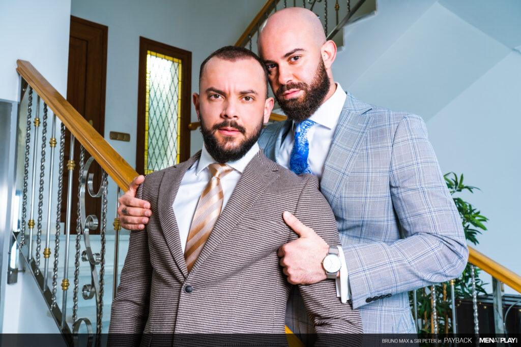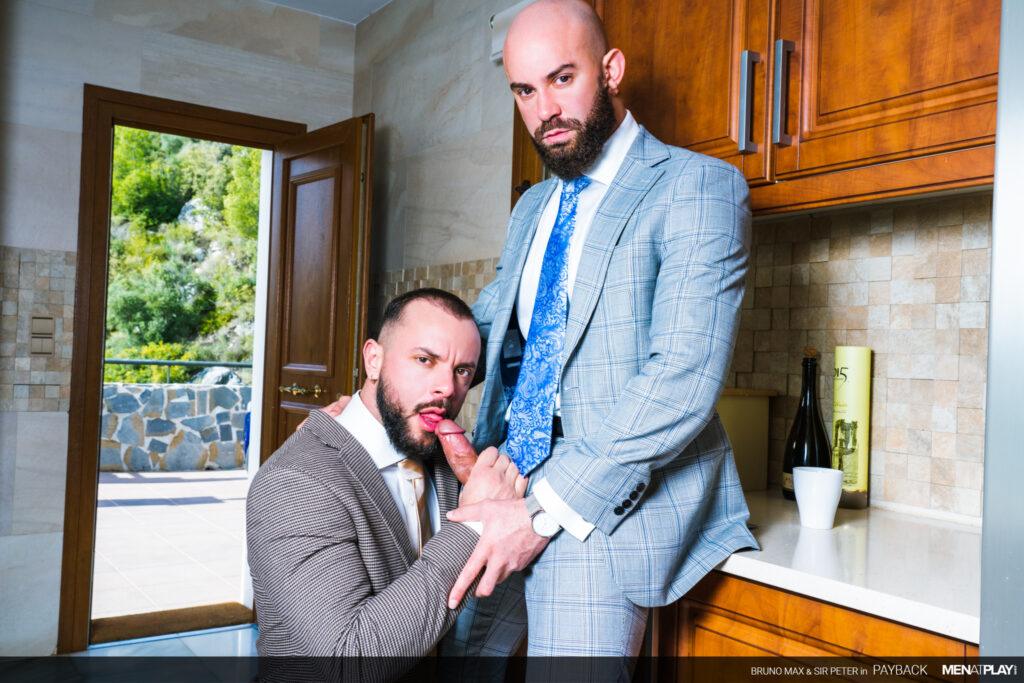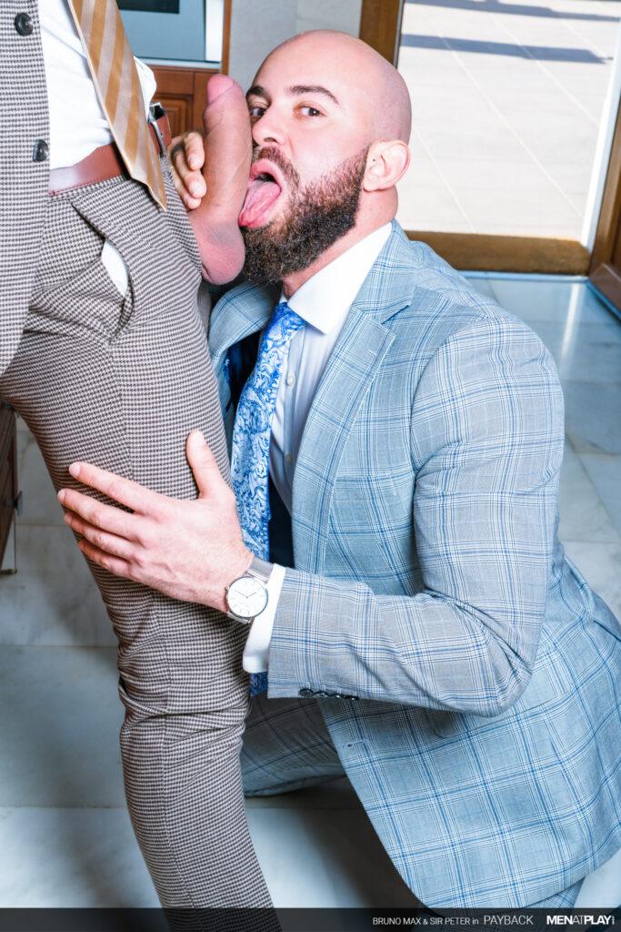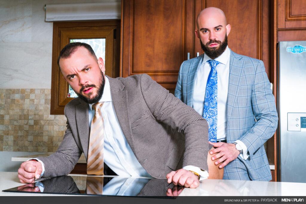 “Sir Peter is having an online meeting with his team when suddenly his boyfriend Bruno Max walks through the background naked, just wearing a towel wrapped around his waist. After the meeting, the embarrassed Sir Peter confronts Bruno and they begin to argue. Seeing as how Bruno doesn’t show any remorse, Sir Peter decides to pay him back by making him late for work. And, Bruno will need to change his now cum stained suit!”