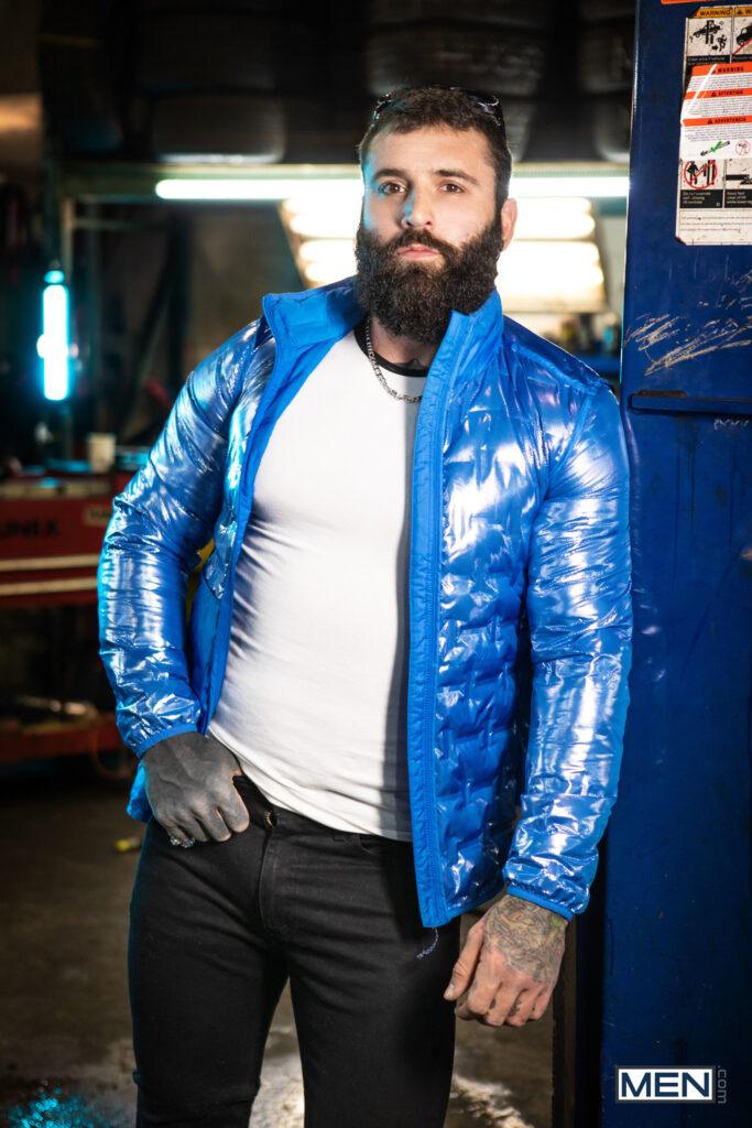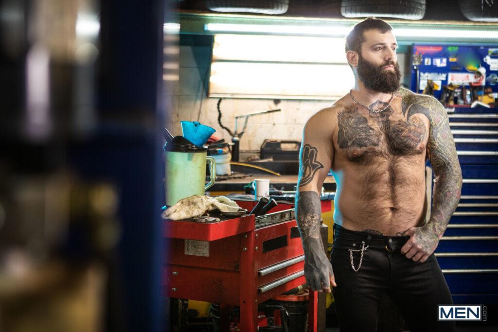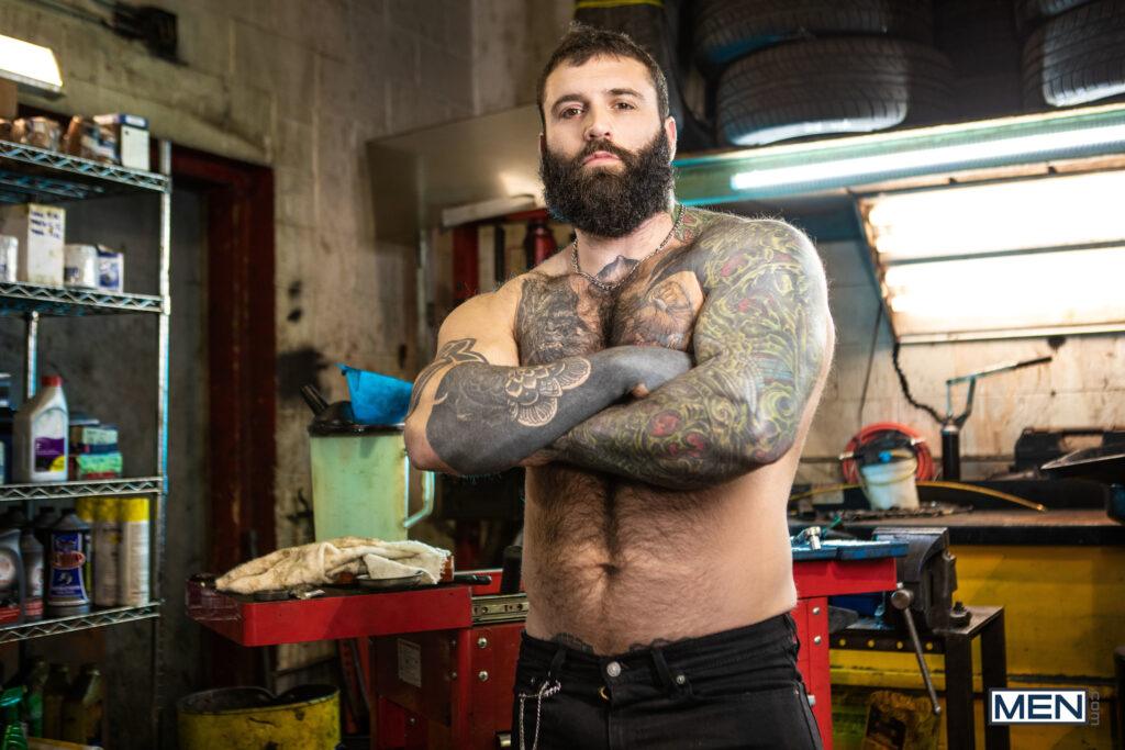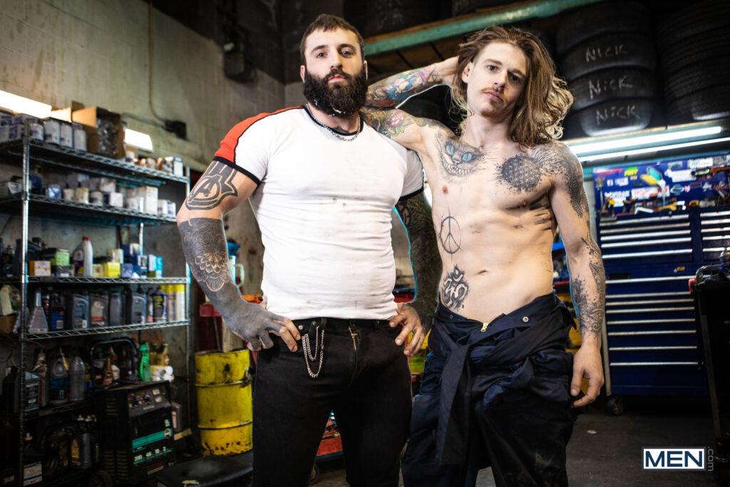“When musician Markus Kage comes into Sunny D’s repair shop, rudely snapping his fingers for service, it doesn’t make the mechanic inclined to drop everything to fix his tour bus. Markus swallows his pride and gets down on his knees, and soon he’s swallowing Sunny’s dick. Sunny puts Markus up against a car and sucks his cock, then turns him around and penetrates his hole doggystyle. The mechanic lies down on his creeper so the bottom can ride him, then pushes up Markus’s legs to fuck him missionary, making the bottom nut. Sunny blows his load on Markus’s beard.”