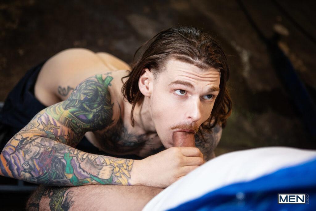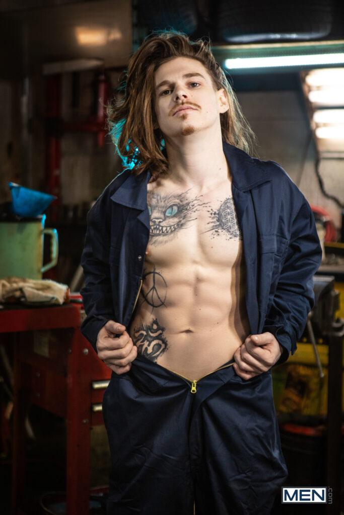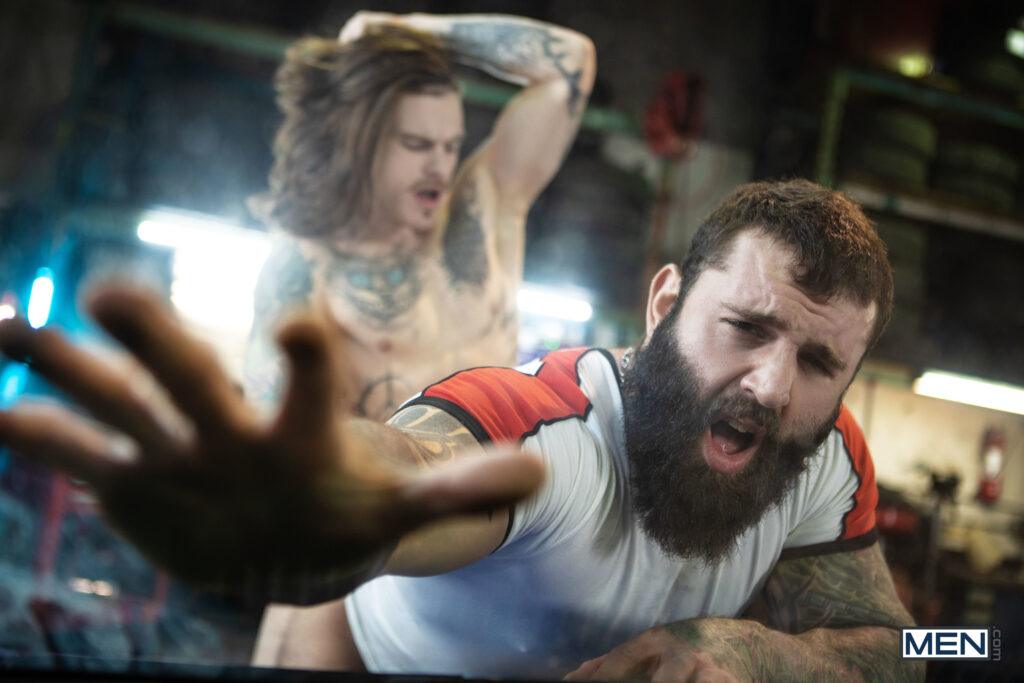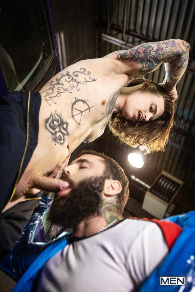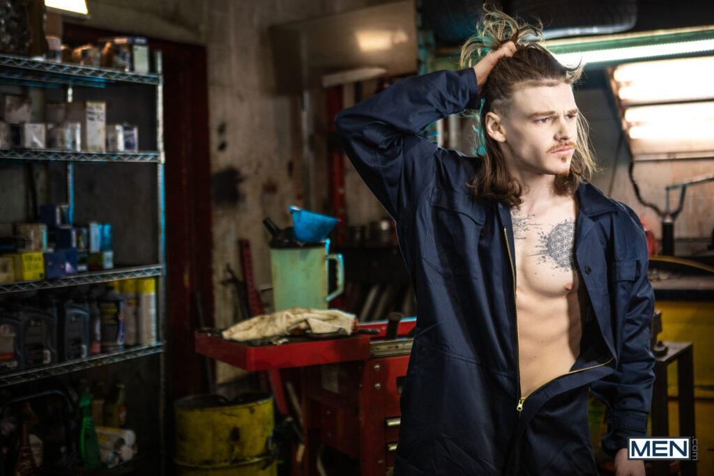 “When musician Markus Kage comes into Sunny D’s repair shop, rudely snapping his fingers for service, it doesn’t make the mechanic inclined to drop everything to fix his tour bus. Markus swallows his pride and gets down on his knees, and soon he’s swallowing Sunny’s dick. Sunny puts Markus up against a car and sucks his cock, then turns him around and penetrates his hole doggystyle. The mechanic lies down on his creeper so the bottom can ride him, then pushes up Markus’s legs to fuck him missionary, making the bottom nut. Sunny blows his load on Markus’s beard.”