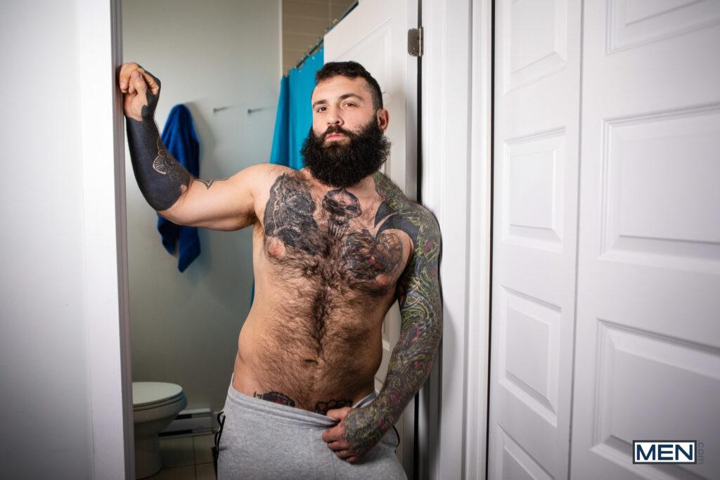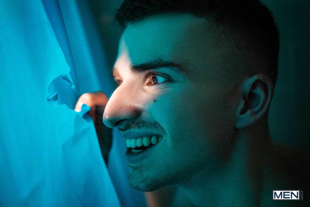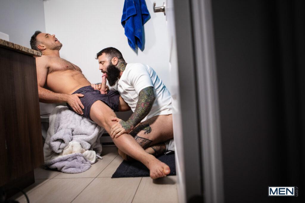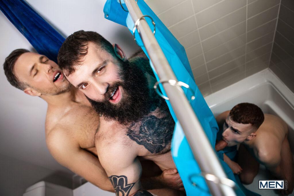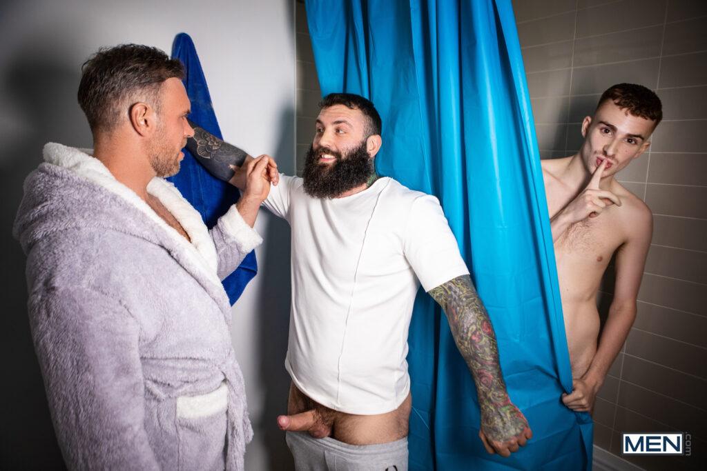 “After his mom kicks him out in the middle of the night, twink Ryan Jacobs goes to stay with his dad Alex Mecum, but even more than the hospitality, he wants some of Alex’s boyfriend, Markus Kage. Ryan sucks Markus’s cock in the bathroom, but the horny twink has to hide in the shower when his dad comes in. But Alex is also horny for some shower sex in the morning, and Markus is caught in the middle! Markus goes down on Alex, then Alex rims him. Markus sticks his cock through a hole in the shower curtain, where the waiting Ryan sucks it as Alex fucks Markus doggystyle. The scheming stepdad bends Alex over and fucks him, and Ryan rips an even bigger hole so he can penetrate Markus doggystyle, cumming on his hairy ass just before Alex blows a massive load. Markus gives Alex a facial, then sends him out for fresh towels, giving Ryan a chance to slip away.”