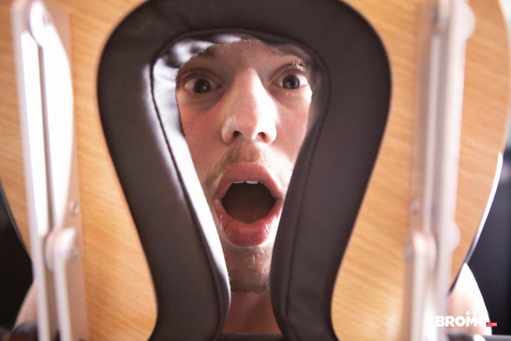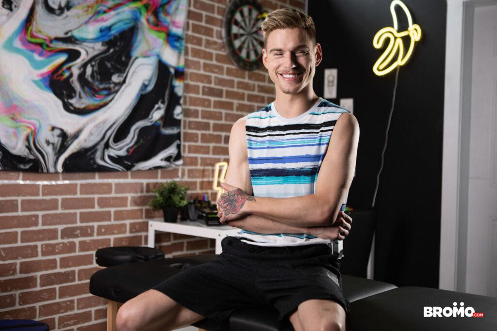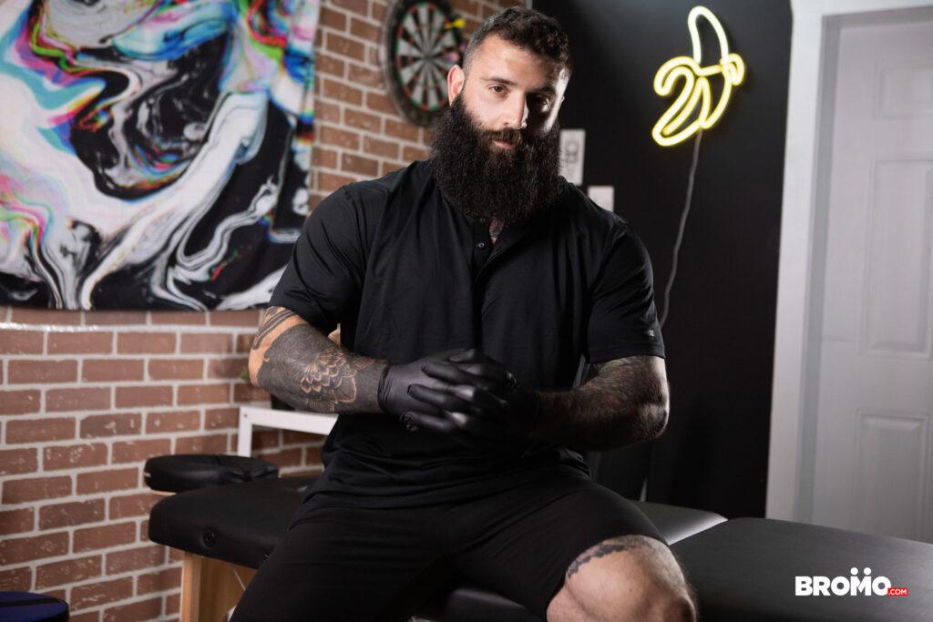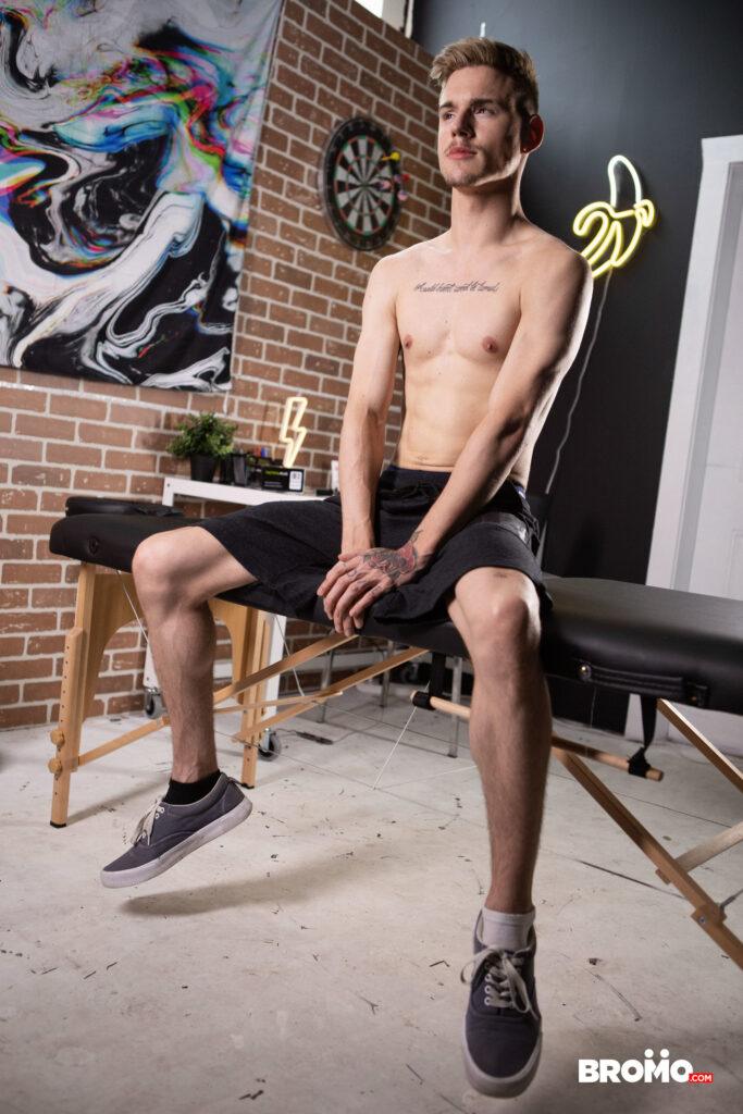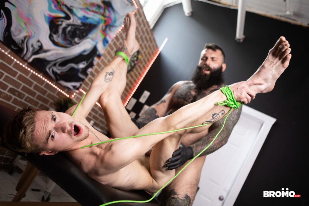 “Lev Ivankov was just planning to get some new ink, but when he spots artist Markus Kage’s bulge through the hole in the table, he decides he wants some dick first! He pulls Markus’s cock out and sucks it, and the tattoo artist fucks the bottom’s face, then strips him and ties his wrists and ankles together with rope before penetrating his hole. Markus turns Lev on all fours on the table, pounding him doggystyle, then unties the twink so he can ride his cock. Lev cums as Markus fucks him missionary, then the top leaves his mark on Lev’s face!”