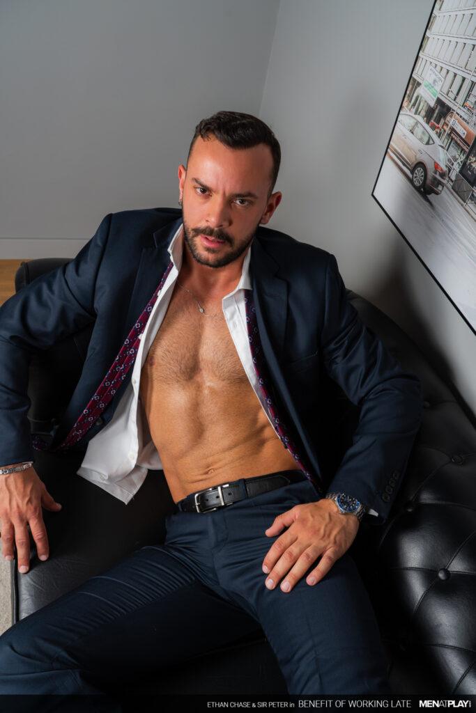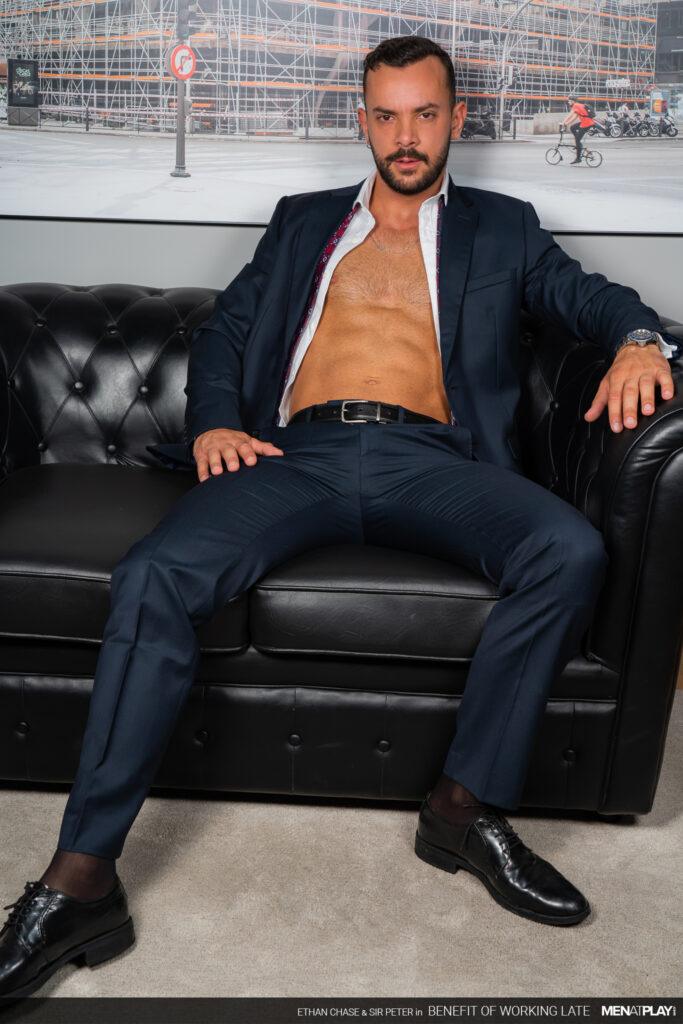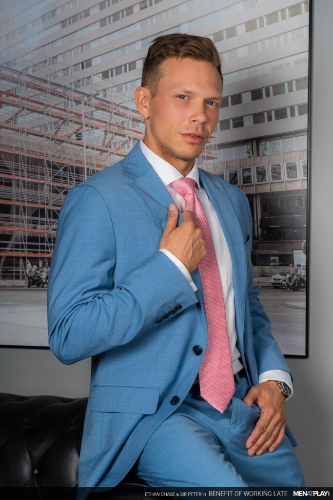 While the muscular blue-collar technician works, Ethan can’t help but stare at him, undressing him with his eyes. As it turns out, Sir Peter has an attraction for white-collar, late working businessmen. And, he has noticed and recognizes the gazing stares from Ethan. It looks like working late does have its benefits!”