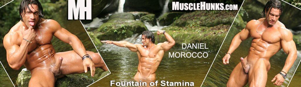 “If they ever want to remake Tarzan, Daniel Morocco would be our first choice to cast in the starring role. We took this ruggedly handsome stud and some other muscle men out into the lush rain forest on Muscle Island and filmed them pumping and posing. Daniel snuck off to a secluded stream, and we followed him. Standing knee deep in the stream, Daniel jerks his hard cock. Light cascades through the trees and shimmers across his hulky body; he dips his hand in the stream and baths his cock. It’s beautiful. Feeling his orgasm rising, Daniel sits down on a rock where he shoots a creamy fountain of cum straight up in the air and it falls across his abs.”
