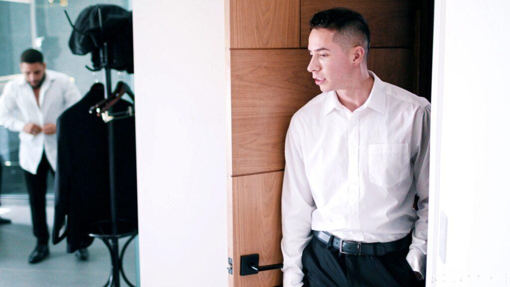 “Brock Banks is getting ready for his wedding with Vincent O’Reilly while his straight best man, Reese Rideout, keeps him company. Brock adjusts his cuffs and smooths out his tux, asking Reese if he looks prepared for his big day. Reese gives him a soothing pat on the back, assuring Brock that he looks ravishing. Despite his supportive energy, Reese can’t help but seem conflicted about something.