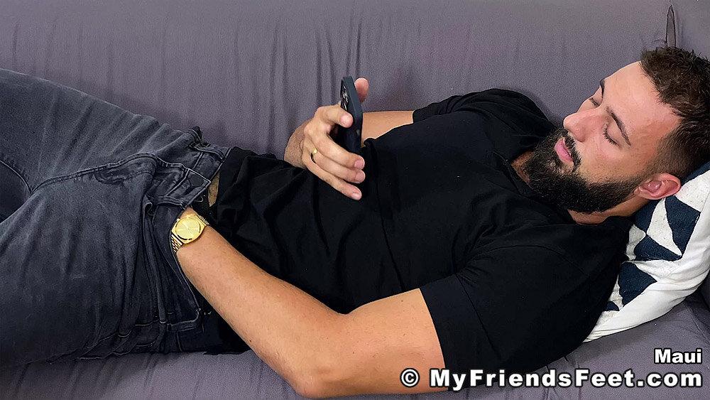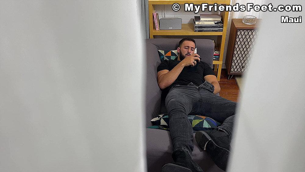 “Maui comes homes and he’s feeling horny while he’s checking his texts. He kicks the boots off of his socked size 13 feet, he starts rubbing his crotch. Does he hear someone outside his open window watching him? Surely no one would spy on him while he jacks off in only his socks. The socks come off and Maui cums with a toe-curl and a grunt before getting up to take a shower.”