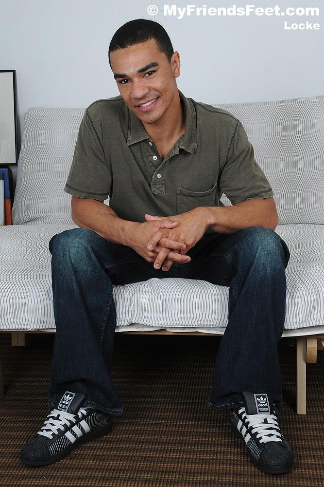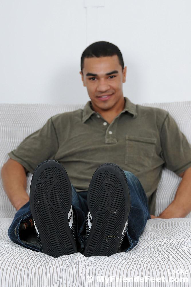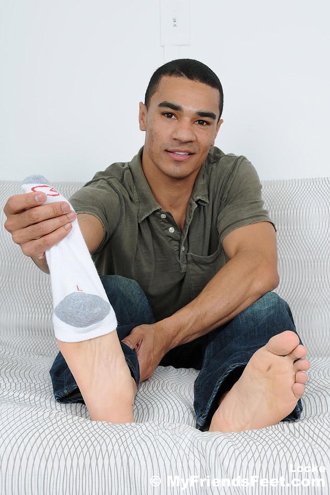 “I hope you enjoy these photos of Locke as much as I liked taking them! His feet look so good in his soft white athletic socks. They look even better out of them as he flexes his toes and wrinkles up his soles. I even got him out of that shirt so we can see his sexy chest.”