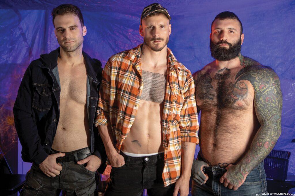 “Exhausted truck drivers Markus Kage and Gabriel Clark are taking a much-needed break from the weeks of Freedom Convoy protests when they start chatting with Windom Gold about experimenting with guys while out on the road. The conversation sees their curiosities and cocks grow with both men soon allowing Windom to suck off their raw trucker cocks. Gabriel even tries swallowing some dick himself before moving down to Windom’s ass to rim and bareback his smooth hole. Without giving the bottom a break to breathe, both Gabriel and Markus fill up Windom at both ends as each rotates between his mouth and ass. Riding Markus’ hairy cock is finally what gets Windom to blow his load right before he drops to his knees and opens his mouth for the fresh cream of these straight strangers.”