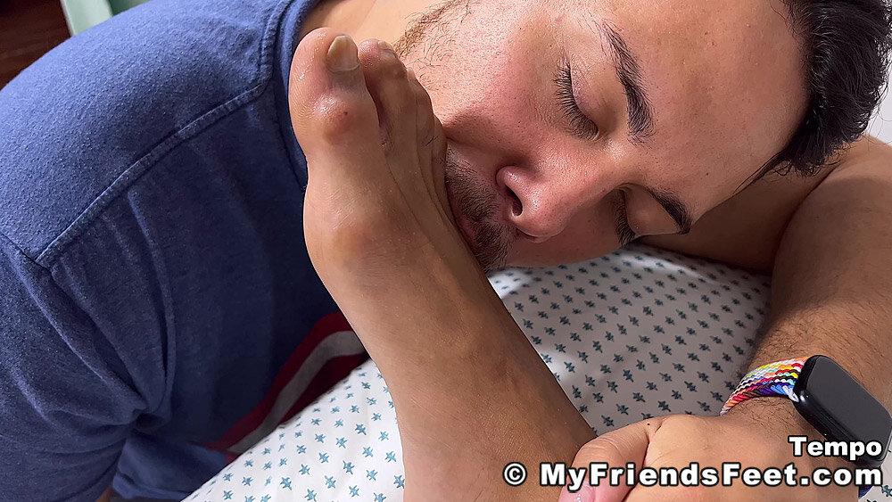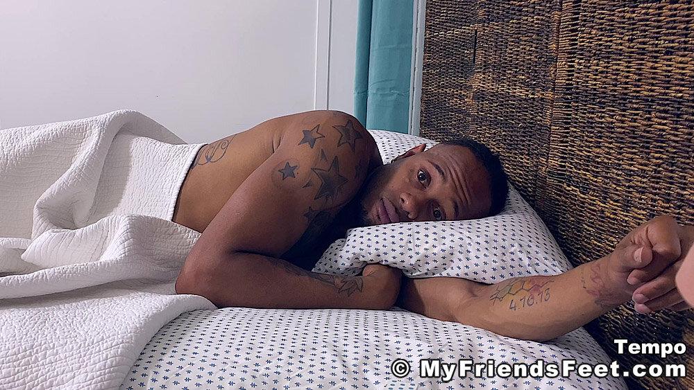 “Tempo’s roommate finds him in bed and uncovers his size 12 feet for a little worship. Tempo is really tired but also enjoying the attention, so he lays back down and allows the foot love to continue.”