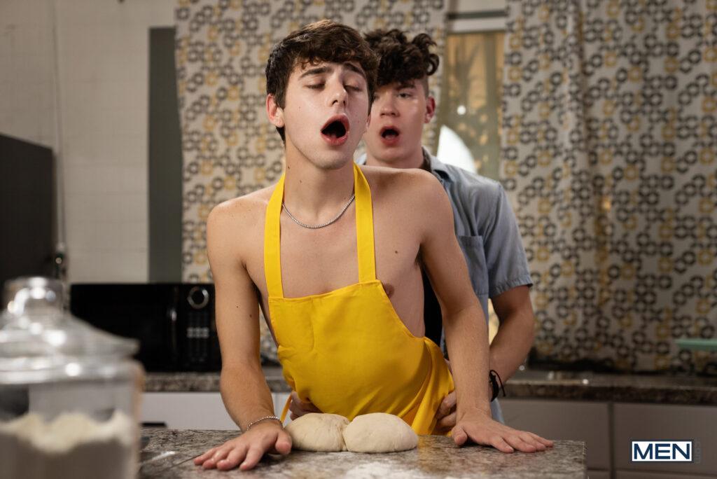 “Joey Mills looks awfully tempting as he kneads dough in nothing but an apron, and his top boyfriend, Drake Von, wants to get between his buns! But just as Drake is about to cum, their guests arrive. Joey leaves him with blue balls to answer the door, so Drake sneakily blows some “cream filling” in the dough. Once Joey gets the biscuits in the oven, he comes out to sit on his man’s lap, and Drake slips his cock back into that hole while their guests are none the wiser… until one finds his biscuit is full of jizz! Looks like brunch is over, but at least now Drake is free to pound that ass in missionary and doggystyle until Joey shoots his own special sauce, then Drake frosts the bottom’s buns.”