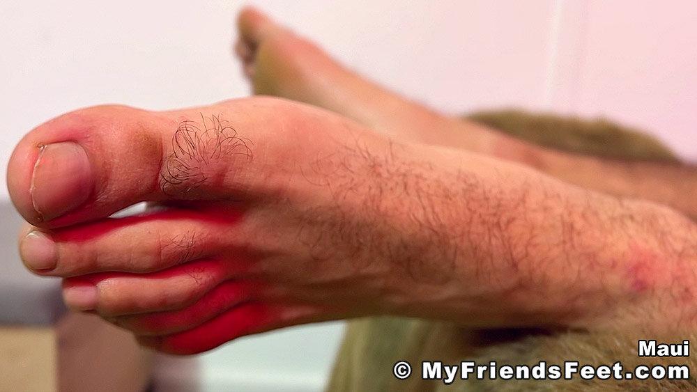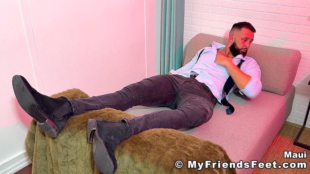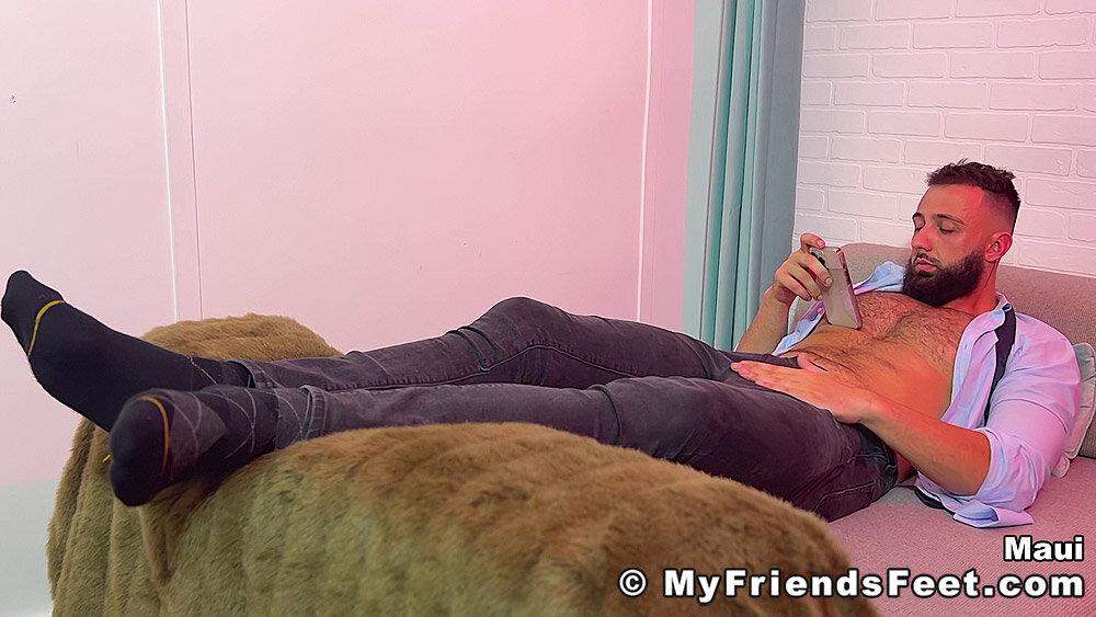 “Cum spy on Maui as he relaxes from his day. We get so close to those enormous size 13 feet, you could almost sniff and lick his soles through the screen. His wandering fingers lead him to some porn on his phone which he is more than happy to start stroking to as well. Maui was definitely horned up because he shoots quite an impressive load all over that beautiful stomach of his! Stroke away Maui! Stroke away!”