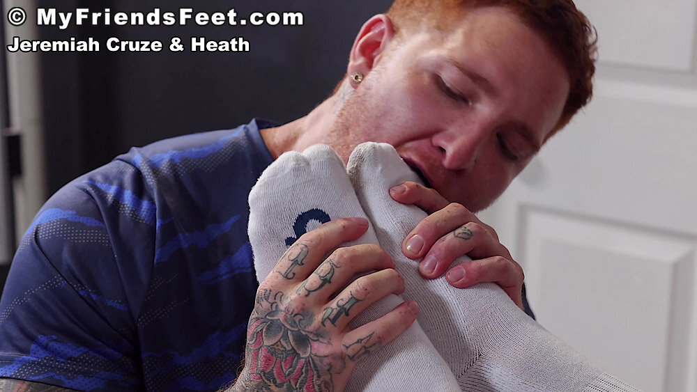 “After a workout at the gym, Jeremiah and Heath were chatting when Heath mentioned that his feet were killing him. Jeremiah said he could help and starts massaging Heath’s size 12 feet. The smell must have been intoxicating, because Jeremiah starts worshiping Heath’s feet. They both get turned on to the point where their cocks are whipped out, Heath starts stroking, and Jeremiah starts fucking Heath’s feet. Huge cum shots from both of these studs!”