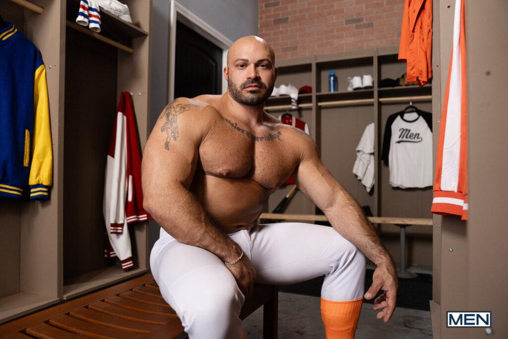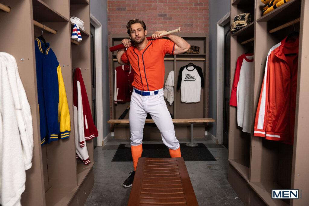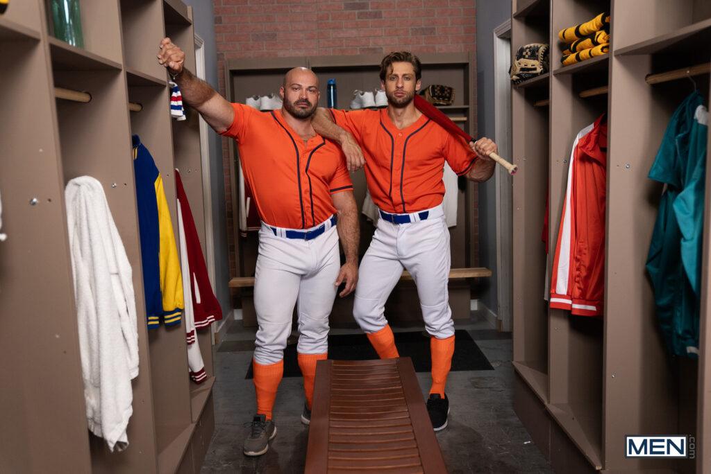 “Hunk Dom King is super disappointed after losing the baseball game, but in the locker room his teammate Nick Cranston tries to cheer him up and lighten the mood with a wedgie as he gets changed. When Nick undresses, Dom can’t tear his eyes away from his buddy’s enormous balls! No wonder Nick’s in a great mood with balls that big. Dom takes out his to compare, and fucks that big sack. The guys suck each other, then Dom bends Nick over and spreads his ass, sliding a baseball bat into his hole! Dom fucks the tattooed bottom doggystyle, and Nick rides the top. Dom holds up Nick’s legs as he fucks him on the bench, and Nick drains his enormous balls before Dom pulls out and cums.”