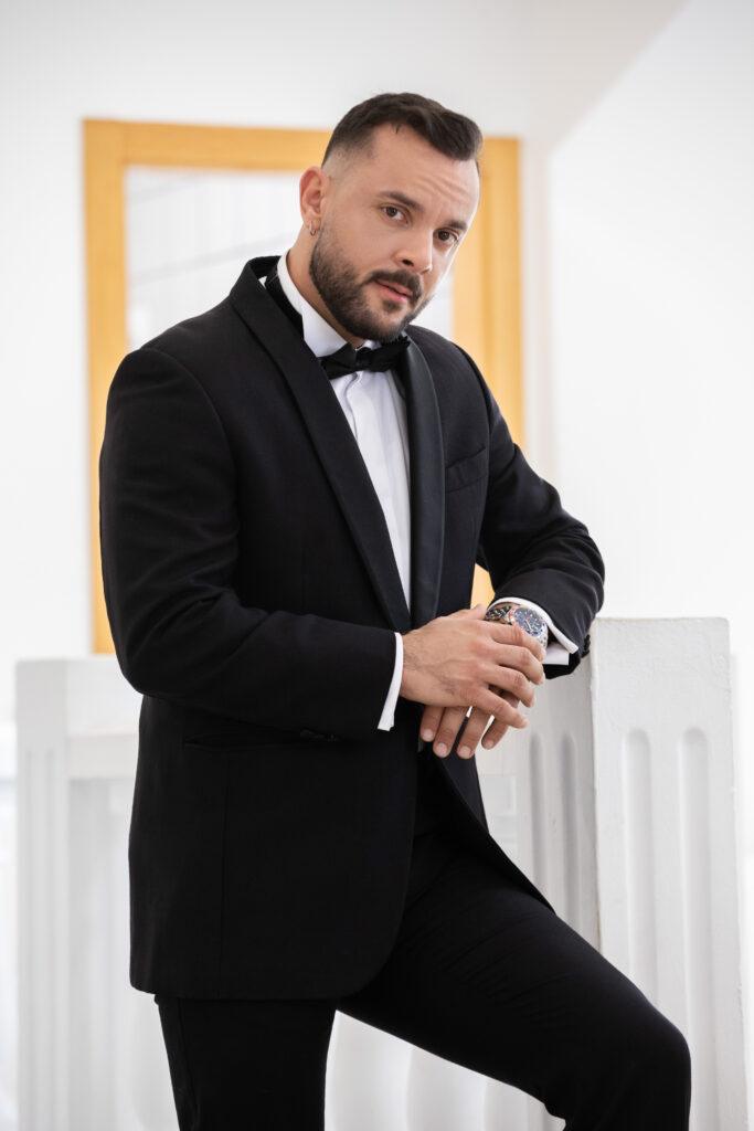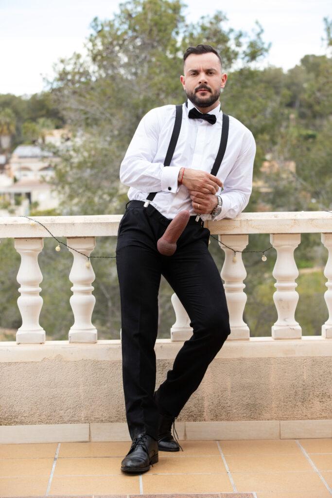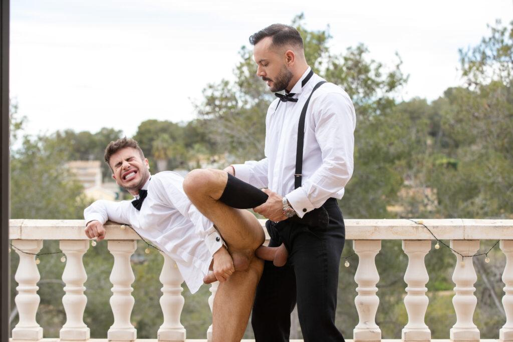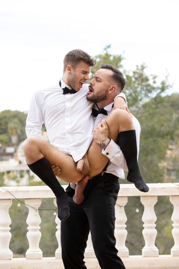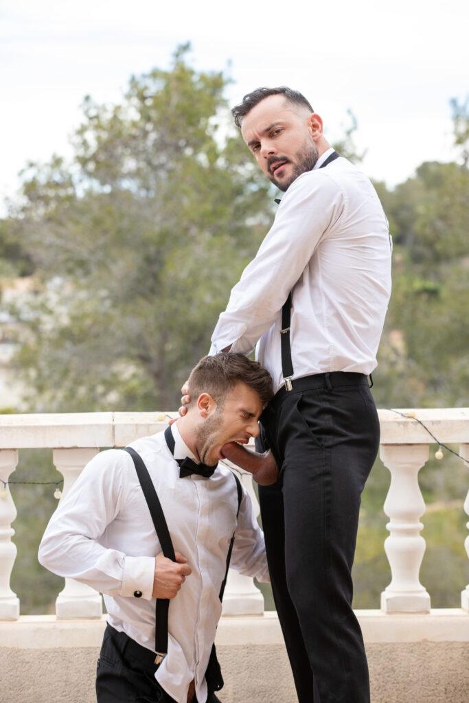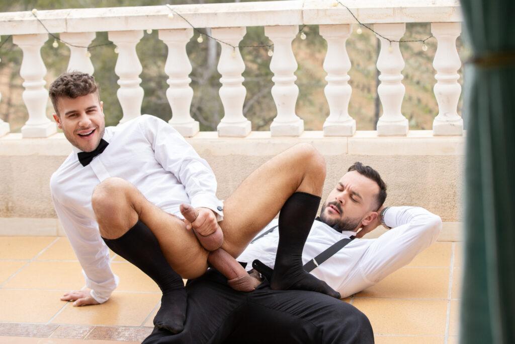 “When tall, bearded stud Sir Peter notices Allen King looking dashingly handsome in his tuxedo, he boldly makes the first move, and it isn’t long before the amorous pair are passionately embracing. After jacking each other off, Allen kneels down to greedily suck on Sir Peter’s long, thick dick in an enthusiastic deepthroat blowjob. Next, the horny bottom gets face fucked before Sir Peter flips him around and drills his tight hole from behind in standing doggystyle. Feeling adventurous, Allen rides Sir Peter, and then the muscular top fingers the bottom’s hole to loosen it up some more before easing his cock back in. Allen strokes himself to orgasm, and then once Sir Peter has had his fill, he pulls out in time to shoot a hot load all over Allen’s face!”