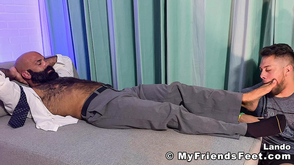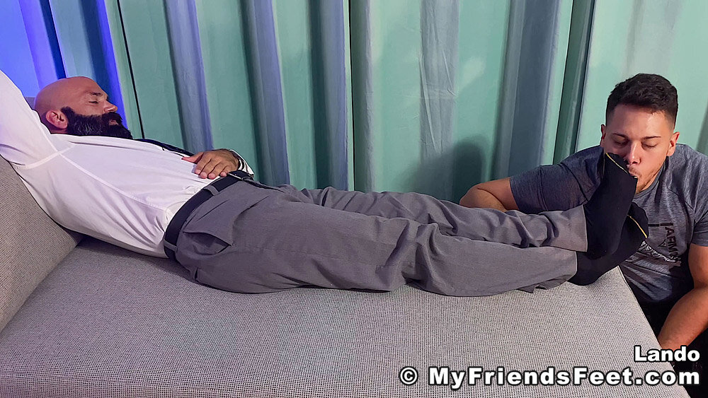 Lando has been looking forward to his foot massage all week. It’s been incredibly busy, but Dan knows exactly how to get Lando relaxed. He starts by worshiping Lando’s tasty size 10 feet in his dress socks and the moans begin almost immediately. Lando gets more comfortable by unbuttoning his shirt, getting his socks removed, and letting Dan lick and suck his toes affectionately. Dan even got a free dinner after how well he did. He’s glad to be of service, I’m sure!