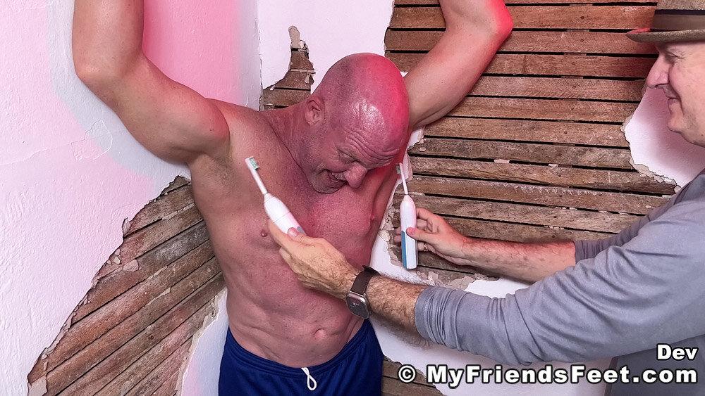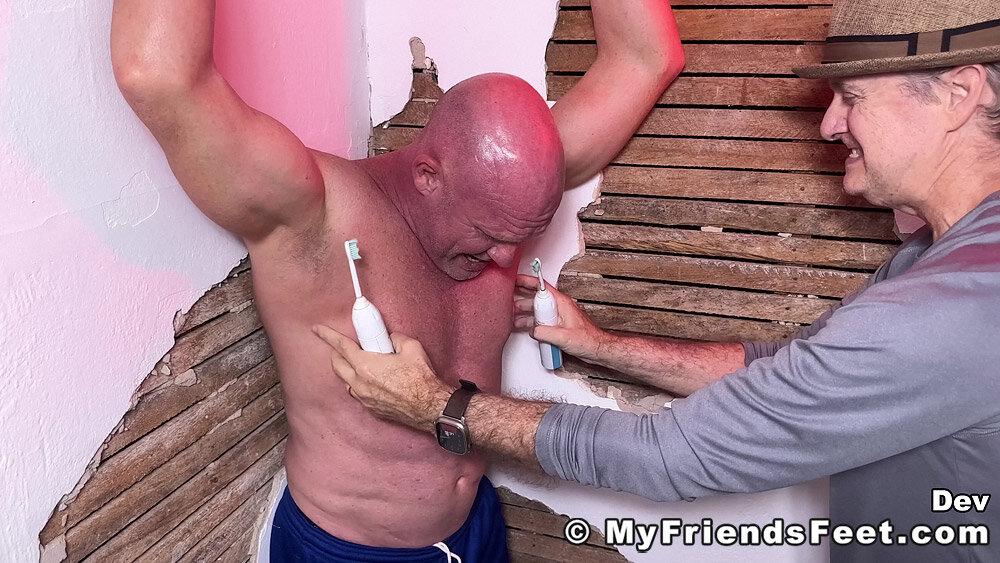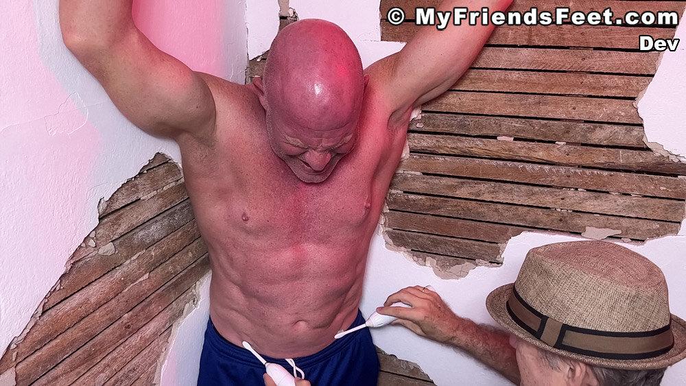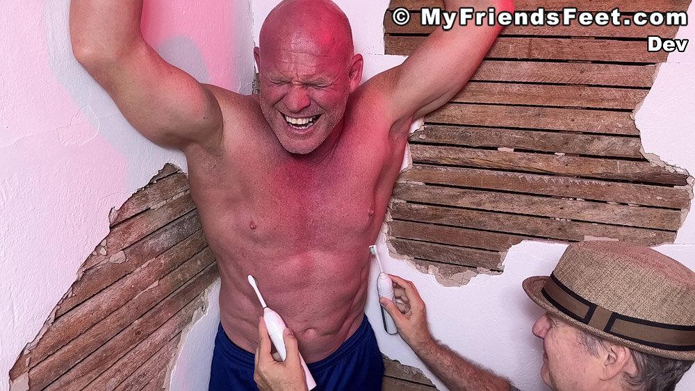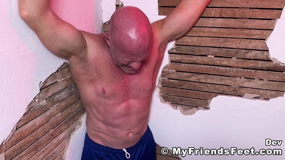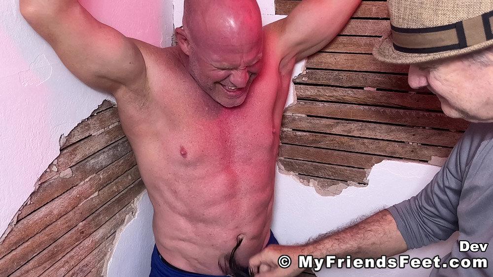 “Dev is definitely a favorite of mine to tickle! I’ve got him secured to the corner with his arms held above his head and ankles tied to the wall. This gives me full access to his upper body, including his very ticklish belly button! He didn’t think I could get to his soles while he was standing, but I always find a way to get to some ticklish soles! Thanks for being such a “stand-up” guy, Dev!”