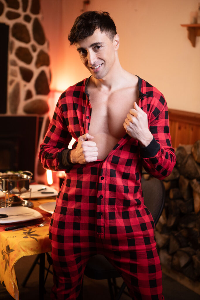 “After a long day in the winter wilderness with their girlfriends, Liam Alyesto gets more than just warmed up as he watches Malik Delgaty take off his coat. Liam opens the butt flap in his onesie and flashes Malik his ass, and when they sit down for some fondue he shows the muscular hunk just what he has in mind on the big baguette, stroking it suggestively and sucking the end. While the women are in the kitchen, Liam gives Malik a hand job under the table, then slips off to the bedroom. Malik follows, finding Liam waiting on the bed on his hands and knees, ass out. Malik gives the bottom what he wants, penetrating that hole. Liam sucks Malik, then the guys fuck in spoon position before he rides the top. Liam cums as Malik drills him on his back before taking a delicious, drippy load on his face.”
