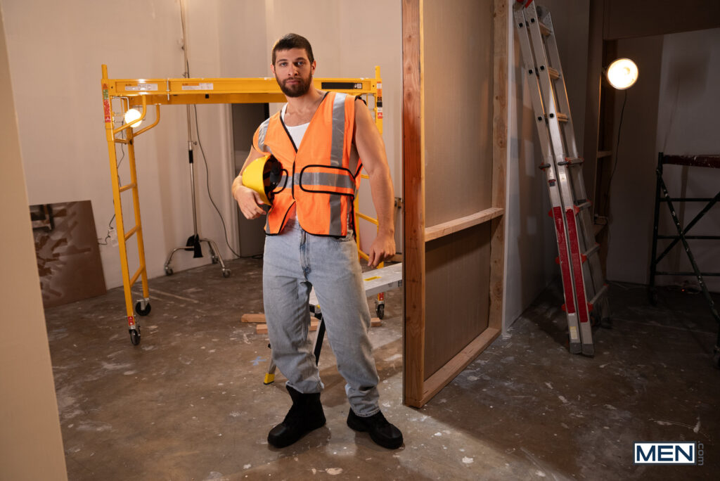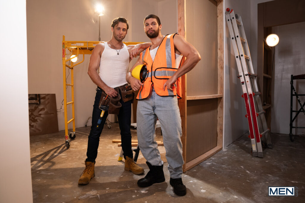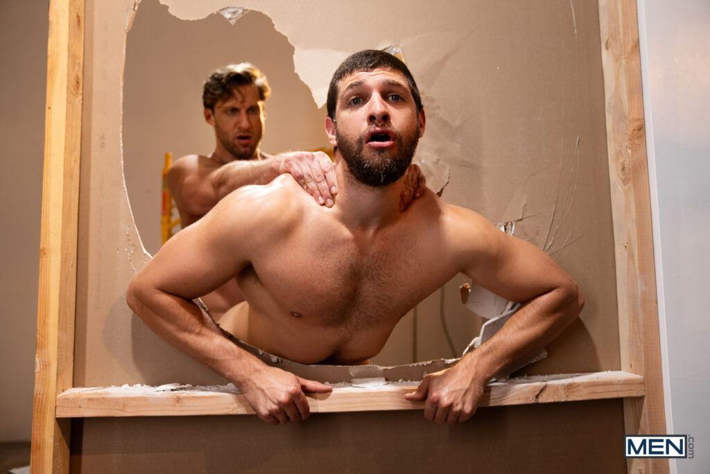 “Muscular construction worker Shamu Azizam is in an embarrassing predicament when he gets stuck in a wall on a job site! Dom King hears him calling and tries to free him, but pushing from either end doesn’t seem to help… but it does make Dom’s dick hard! He takes it out and the trapped bottom eagerly sucks it, then Dom comes around to fuck him doggystyle. The hard pounding finally dislodges him, and they fuck doggystyle and missionary, till Shamu begs the boss to cum on his face.”
