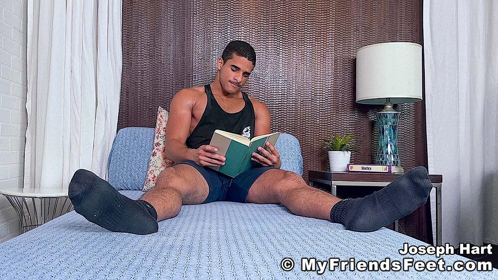 “Lying on his bed and grabbing a good book, Joseph Hart kicks off his sneakers and starts to rub his black socks together. He knows you’re there, but he knows you like the view more. He takes off his tank top to get a little more comfortable. Slowly, he removes each sock so you can see his intoxicating soles and delicious toes. If you’re lucky, he might even wiggle them for you!”