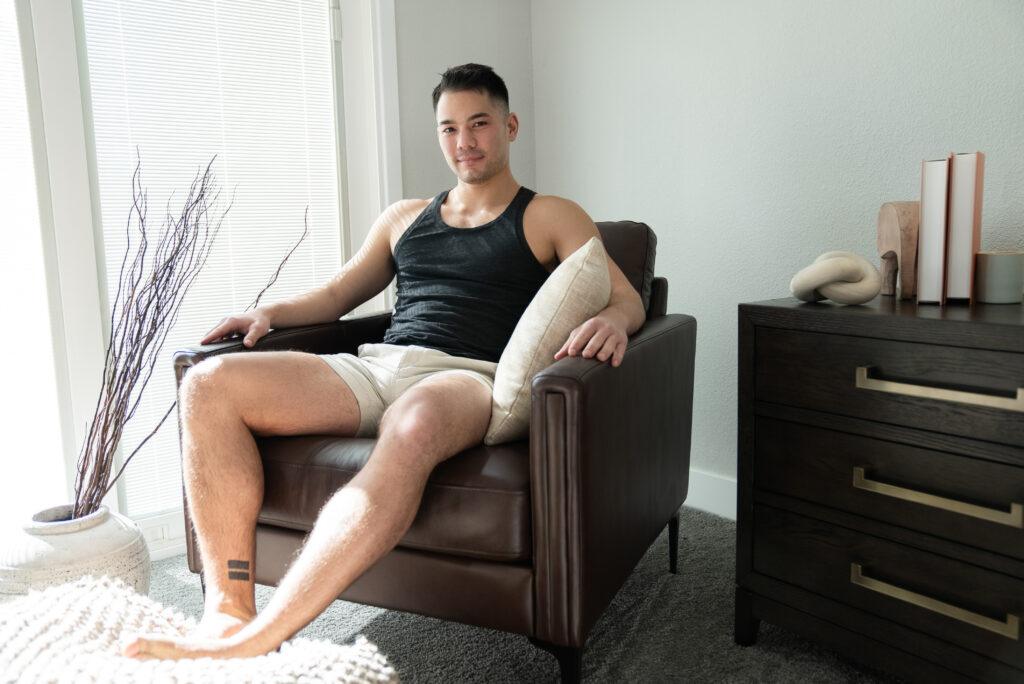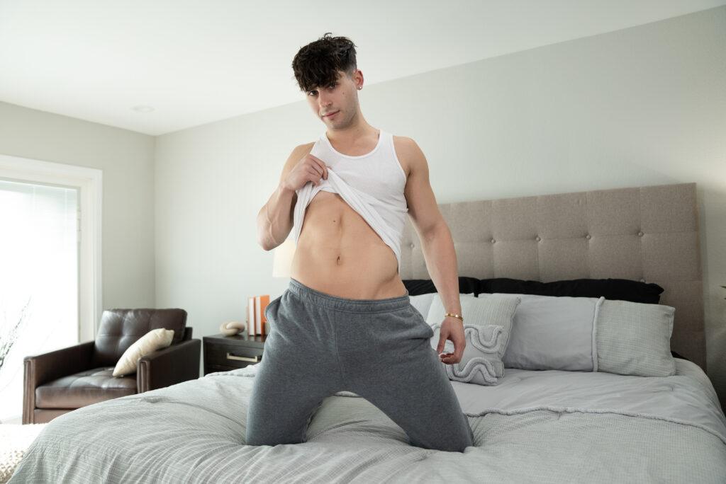 “Michael Vente entices Colton Reece to the bed as he reaches into his gray sweats to rub his cock. The guys sensually kiss and touch each other, and Michael rolls Colton over so he can kiss his chest, lingering over his nipples, then sucks Colton’s cock. Colton rims the bottom and teases him, making him ask for that dick before finally giving Michael what he wants on all fours. The bottom cums as Colton fucks him on his back, and Colton pulls out to shoot on Michael’s face.”