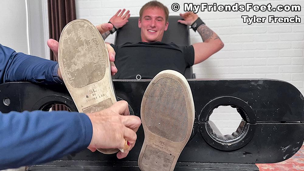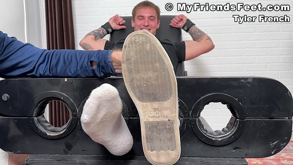 “Tyler French has never been tied up and tickled before! Even though he knew he was incredibly ticklish, he still agreed to be tied down. He giggles when I start poking his sides and his size 10 and a half feet definitely were responsive, even through his thick white socks. He tries to break free, but Dan and I put him right back in the restraints and tickle him until he’s red up and down his entire body. Tyler says it was torture, but he does agree that he would come back! You’re welcome here anytime Tyler!”