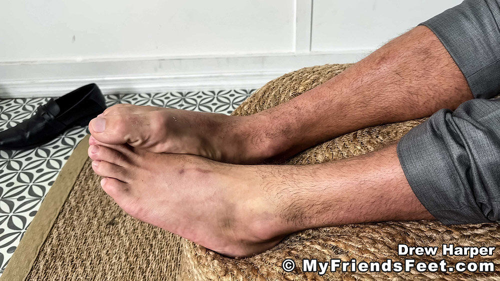 “Businessman Drew Harper works hard for his money and plays just as hard. In a moment of rest and relaxation, he takes off his dress shoes to reveal his hot dress socks all propped up for our viewing pleasure. He takes his shirt off, rubs his feet together, reveals those sexy soles and continues to curl those delicious toes for all to drool over.”