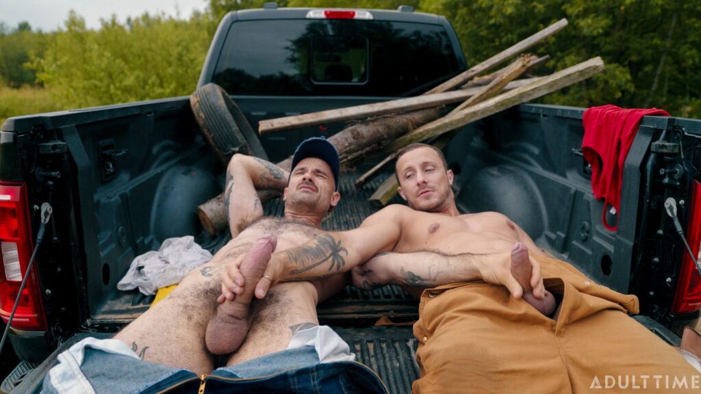 “Two sweaty farmhands, Zack Mackay and Tito Patron, are taking a break from work when they casually gossip about the farmer’s hot farm girl. They get hot and bothered during the conversation, popping boners beneath their overalls. Since the farmer’s not around and the boners aren’t gonna go away themselves, Zack and Tito decide to extend their break and rub one out right then and there in the back of the pickup truck. But there’s something about all that fresh country air that leads to them doing MORE than just jerking off!”